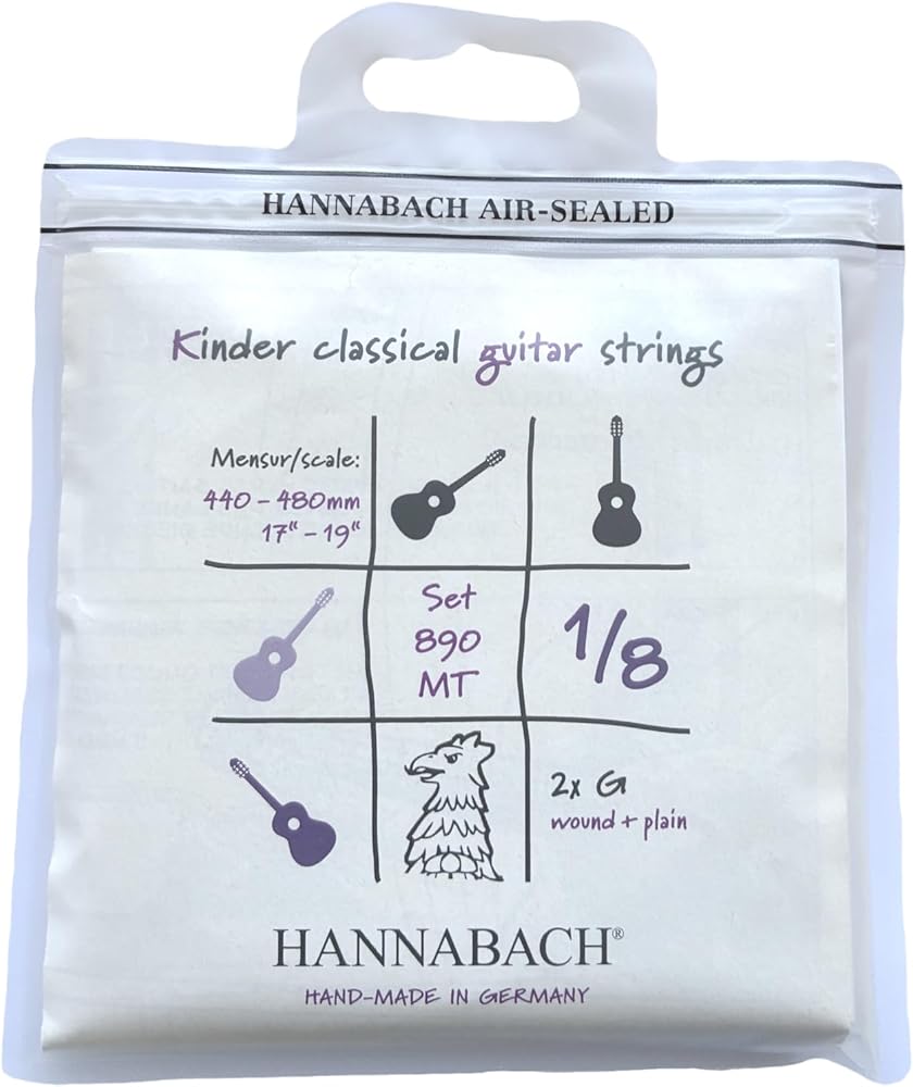 Set / Children Guitar 1/8 size Scale length: 44-48 cmMedium TensionTrebles: NylonBasses: Nylon/Silver-plated woundSeries 890 - Strings for Children Classical Guitars. Offer top quality for the youngest among the guitarrists. Specially designed for children guitars with different sizes. Clear nylon trebles. Bass strings are wound with a silverplated round wire. The tension of the strings is specially matched for children. Hannabach Quality for Kids.