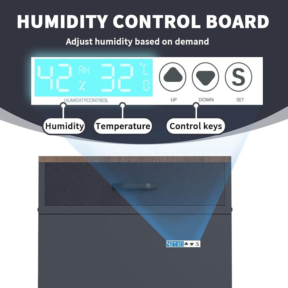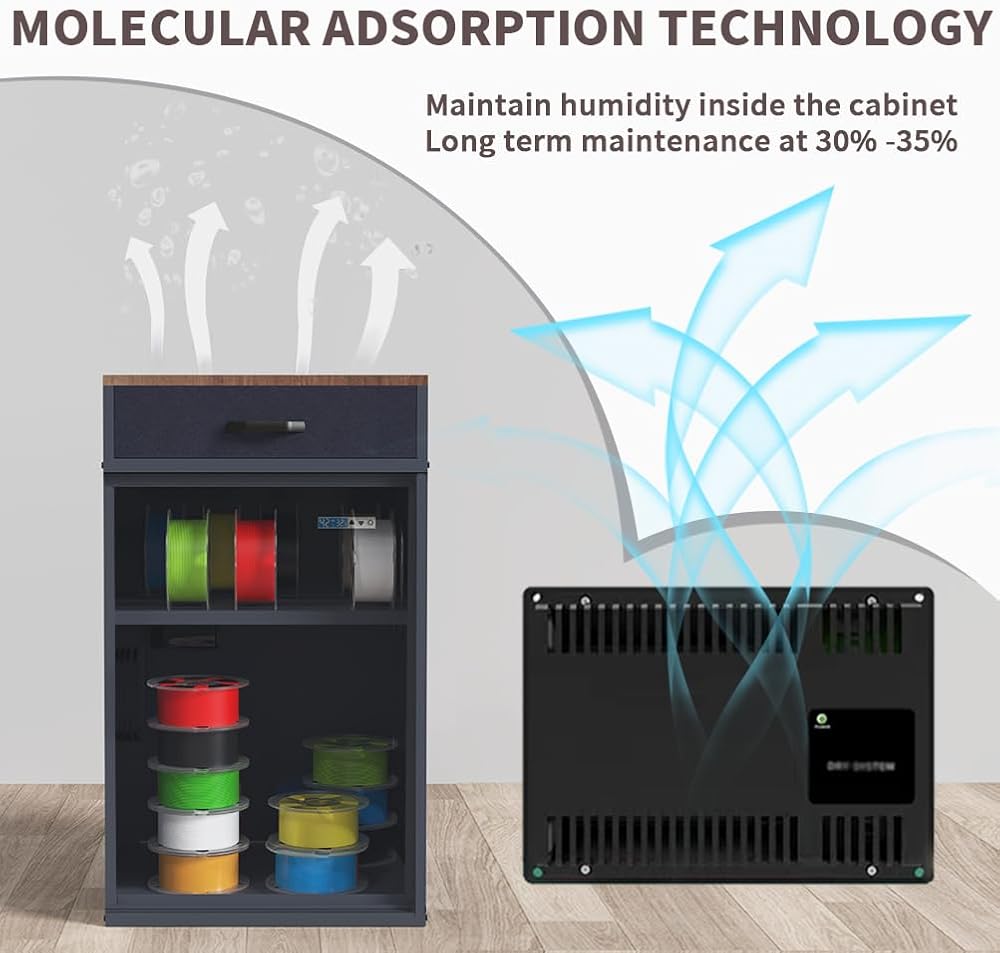 【Self-Sustaining Molecular Adsorption Dehumidification】Advanced molecular adsorption technology continuously traps moisture without disposable desiccant. Maintenance-free operation eliminates refills. Engineered for absolute silence (0dB noise) – ideal for studios, labs, and noise-sensitive workspaces.Note:The dehumidification function is designed not for rapid drying of moisture-laden products, but rather to ensure long-term preservation of filaments by maintaining the cabinet's internal humidity within a range of 30% to 35%, thereby guaranteeing prolonged service life and reliability of the filaments.