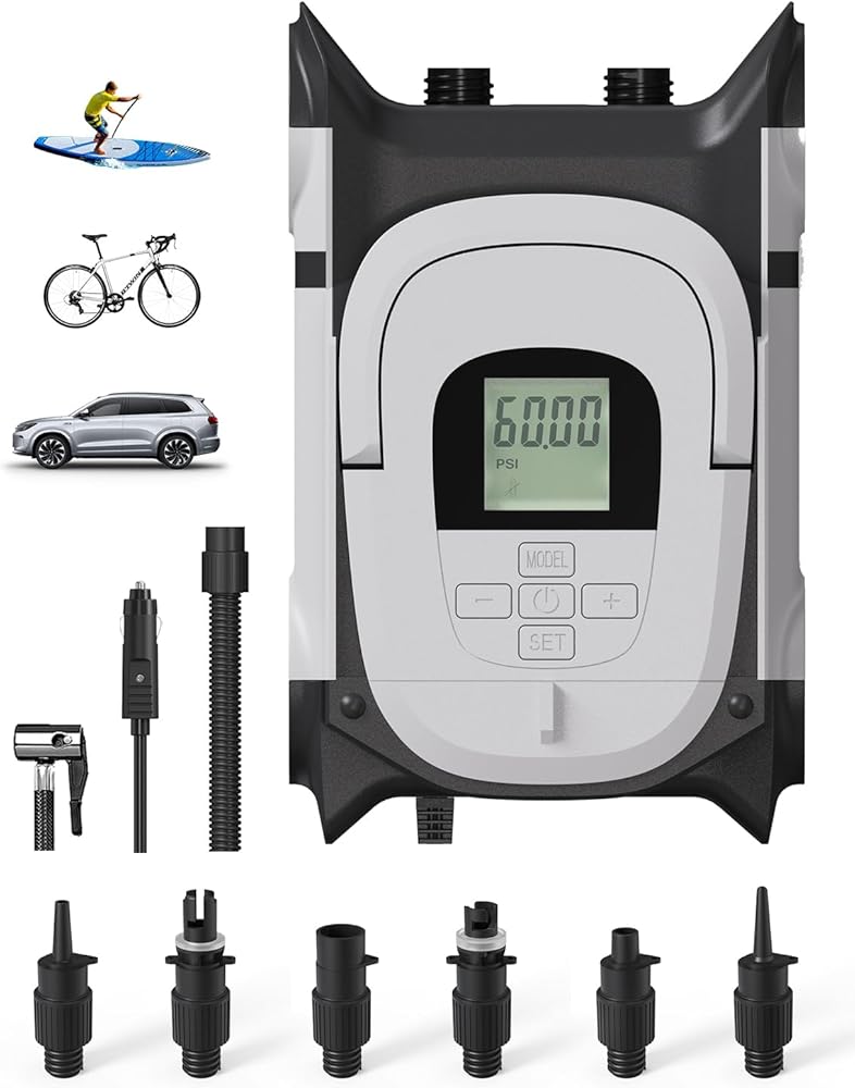 Widely useful:Sup inflator pump electric comes With 6 Nozzles, The paddle board pump electric portable is Widely used for water sports and camping trips, such as SUP, boats, kayaks, and mattresses.