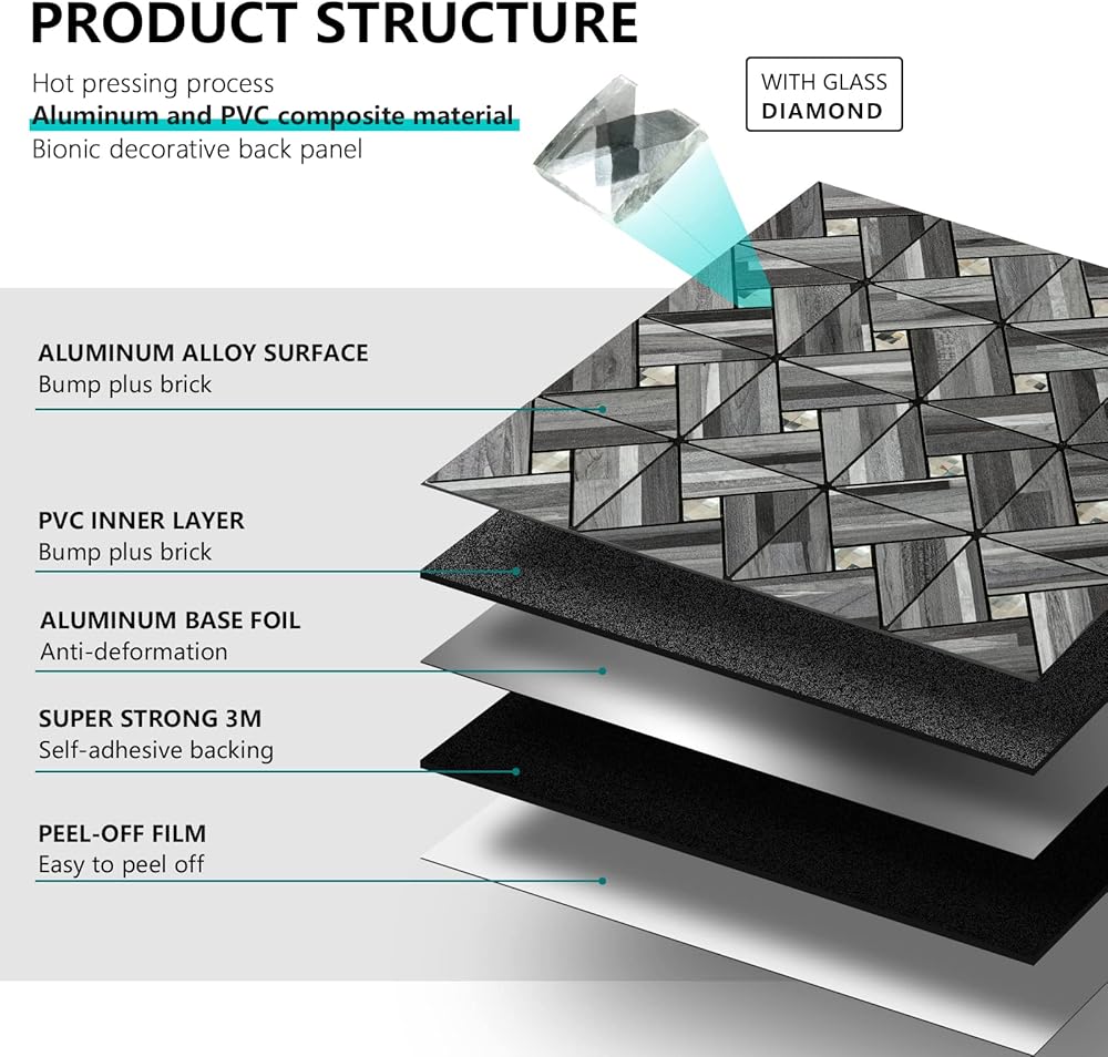 Superb adhesive strength. Stronger adhesive backing than regular vinyl splashback tiles, it not only sticks firmly to smooth, clean surfaces, but can also be used on lightly textured walls.