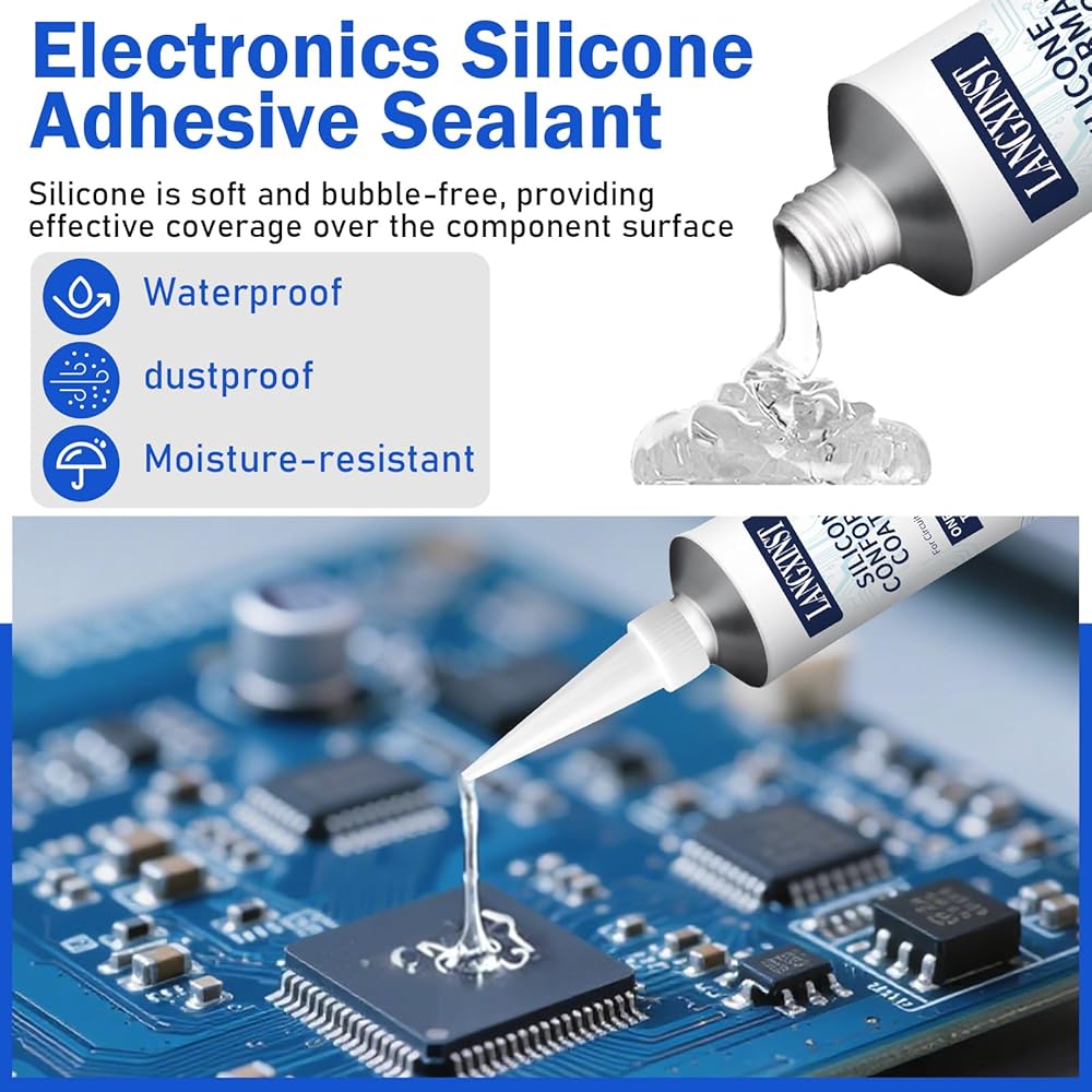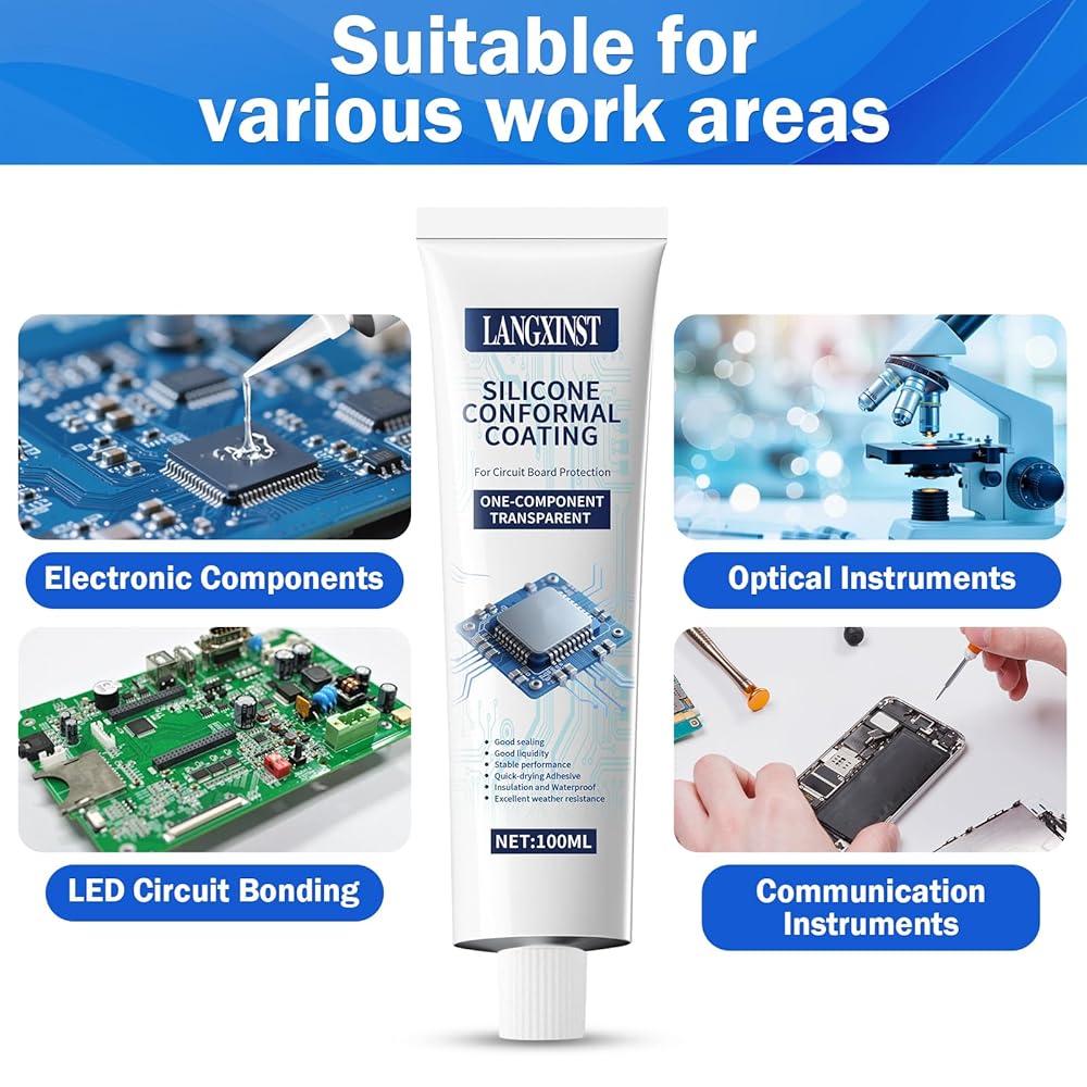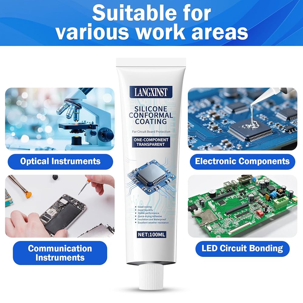 Conformal Coating:Electronic adhesive is professional grade, high adhesion, Dry in 15min, Formulates a transparent, flexible silicone barrier that seals out moisture, dust, and corrosive elements, preventing short circuits and extending the lifespan of PCBs