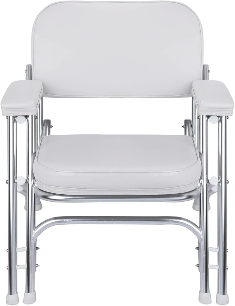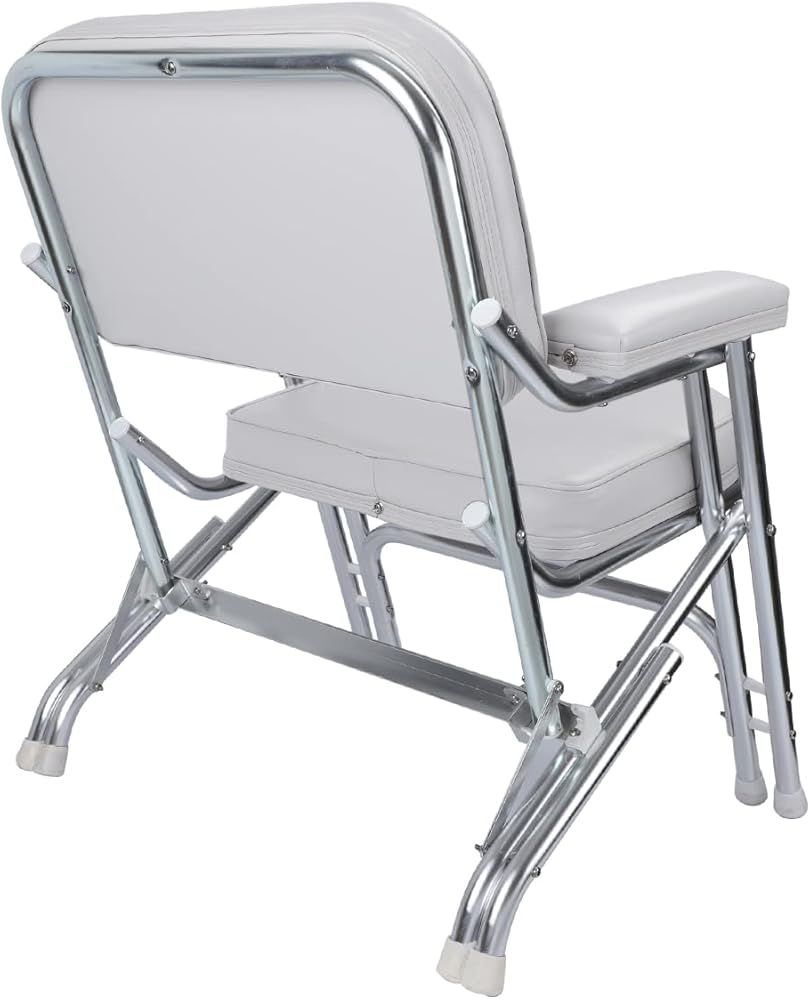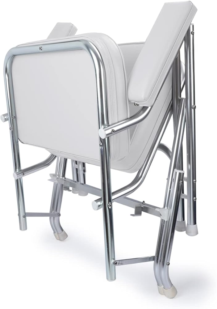 Comfortable folding chair is ideal for boat decks, docks and patios - folds easily to stow away when not in use. Special 8 Legs Design for Stability. Durable anodized aluminum frame with composite leg tips to protect your deck, making it a dependable choice for long-term use.