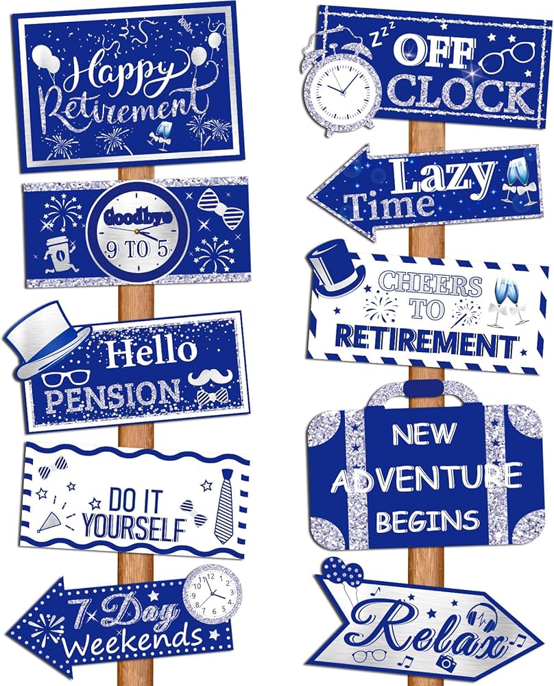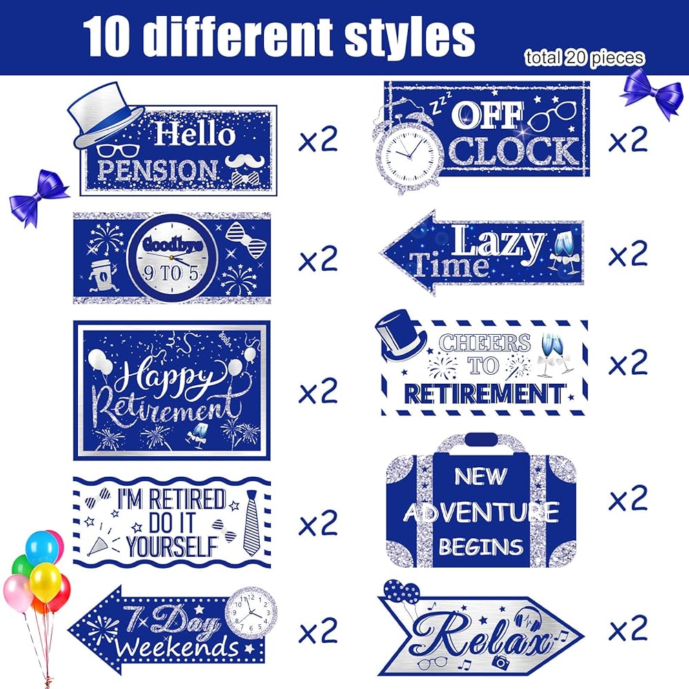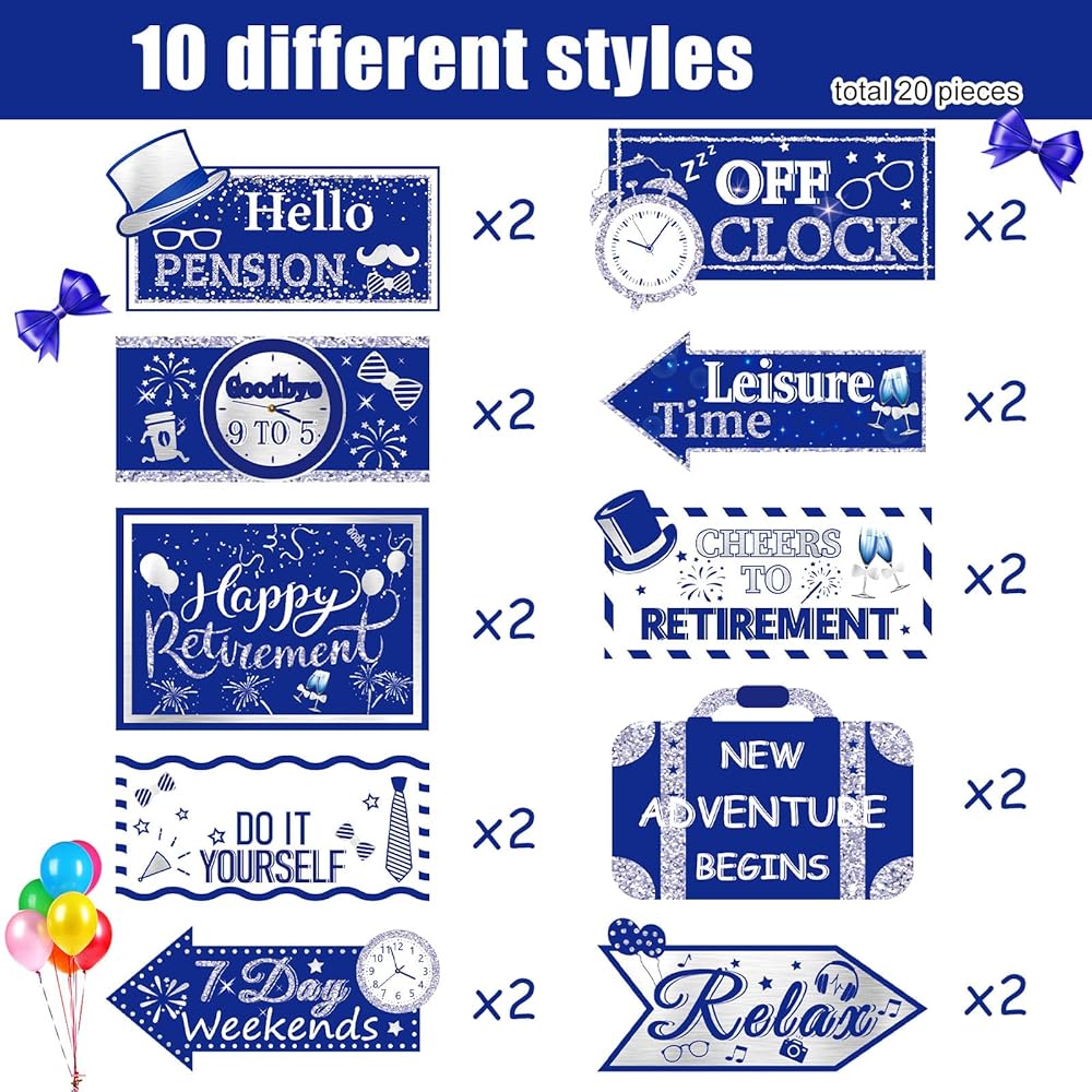 10 Styles: the package contains 20 pieces retirement party directional sign decors in 10 different styles, 2 pieces per style, enough to meet your needs for party decorations; You can also share them with your family members and friends to have a happy retirement theme party together