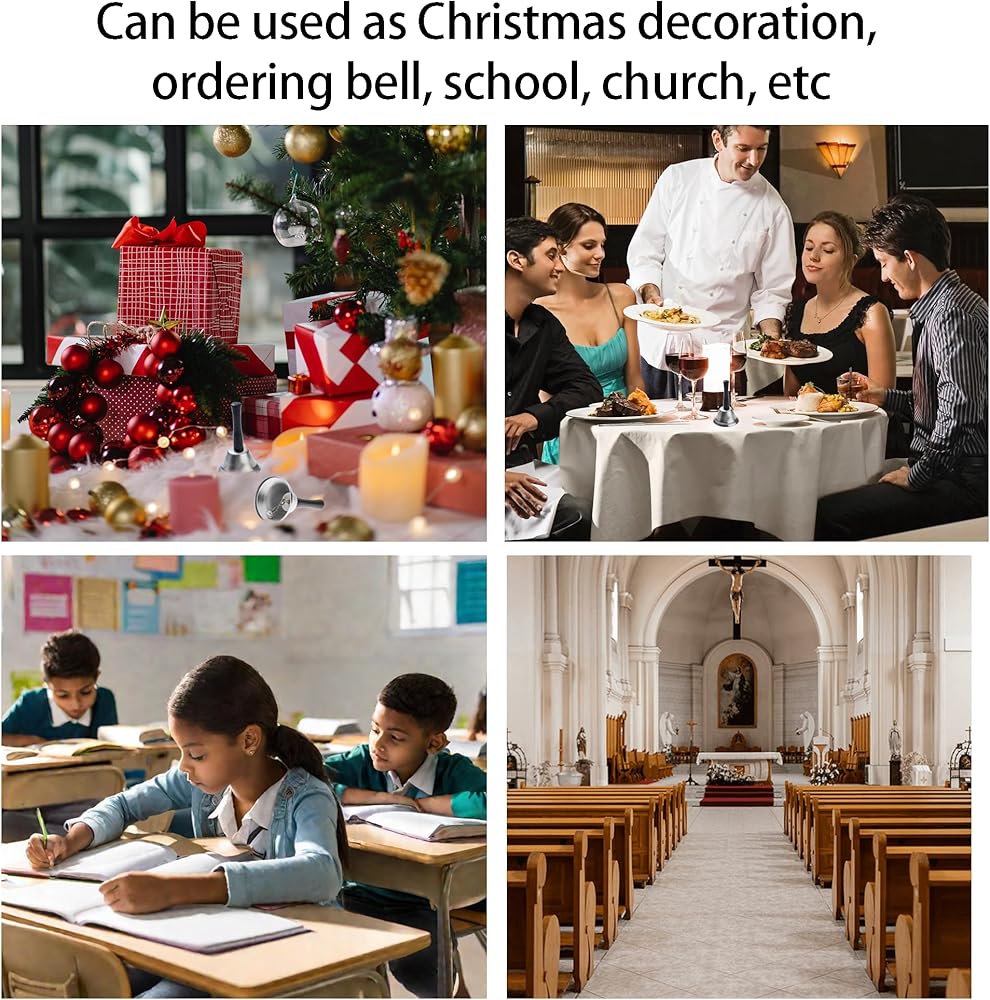 Comfortable design:Each hand bell is sized perfectly and features an ergonomic wooden handle,providing a comfortable grip.The matte surface of the bells of steel adds a touch of advanced elegance,making them suitable for festive table decorations