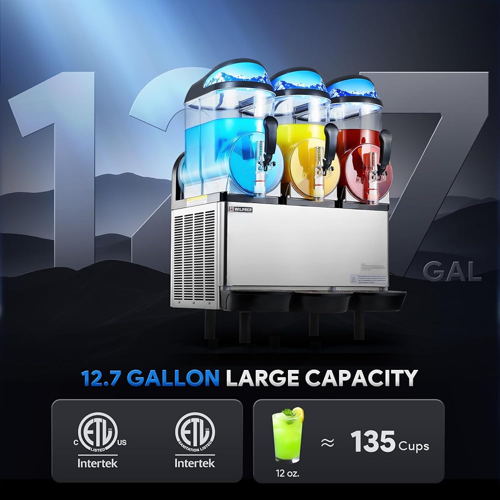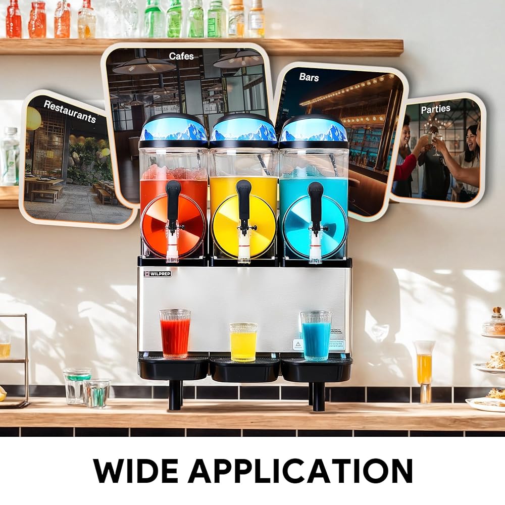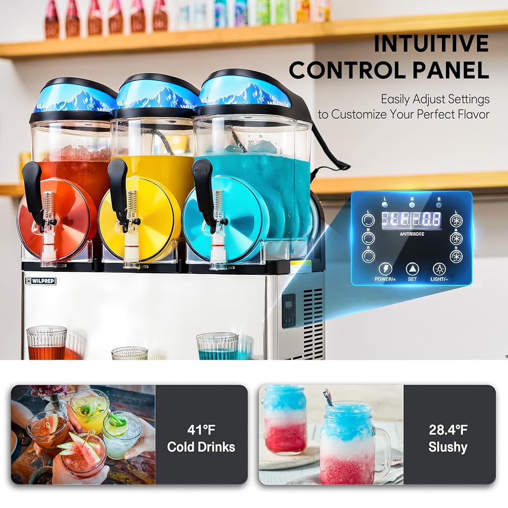 Slushy Drinks in Minutes: Wilprep's ETL & ETL Sanitation certified slushy machine features a high-efficiency Embraco compressor, delivering perfectly blended slushies and cold drinks, offering up to 3 different flavors