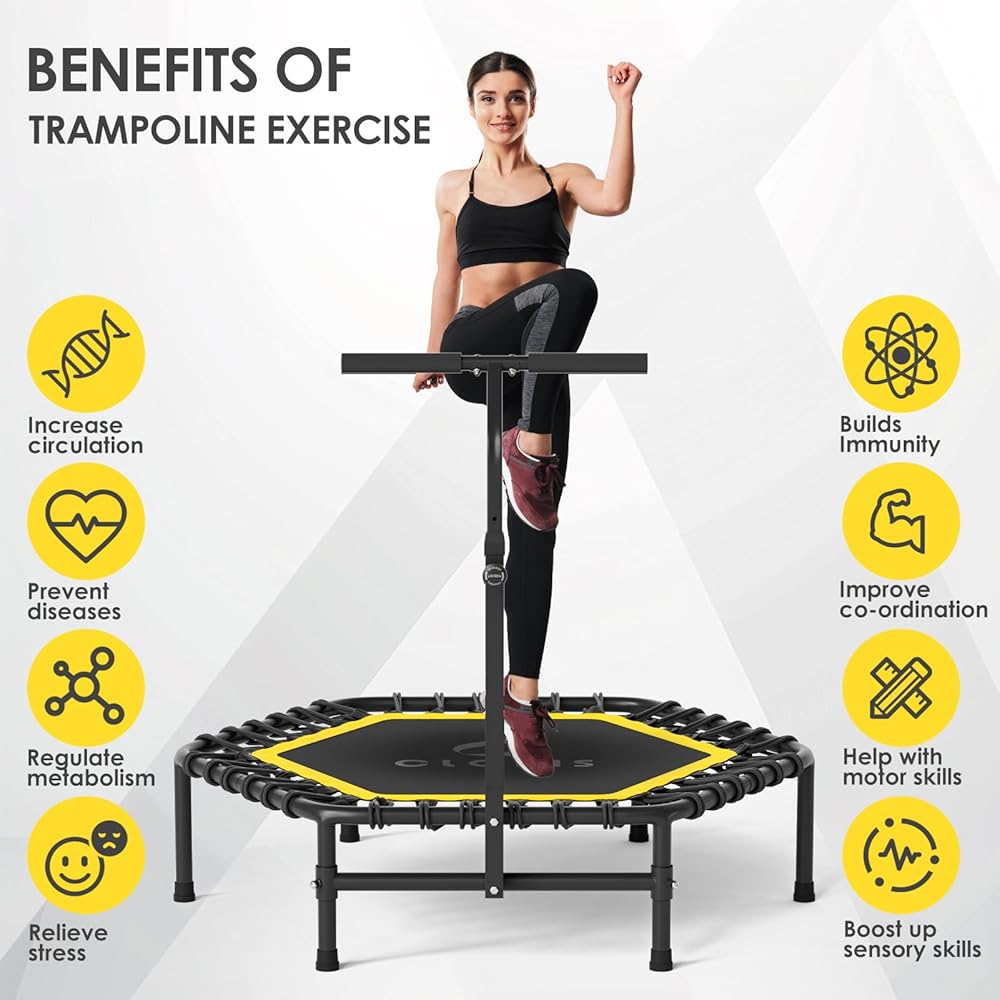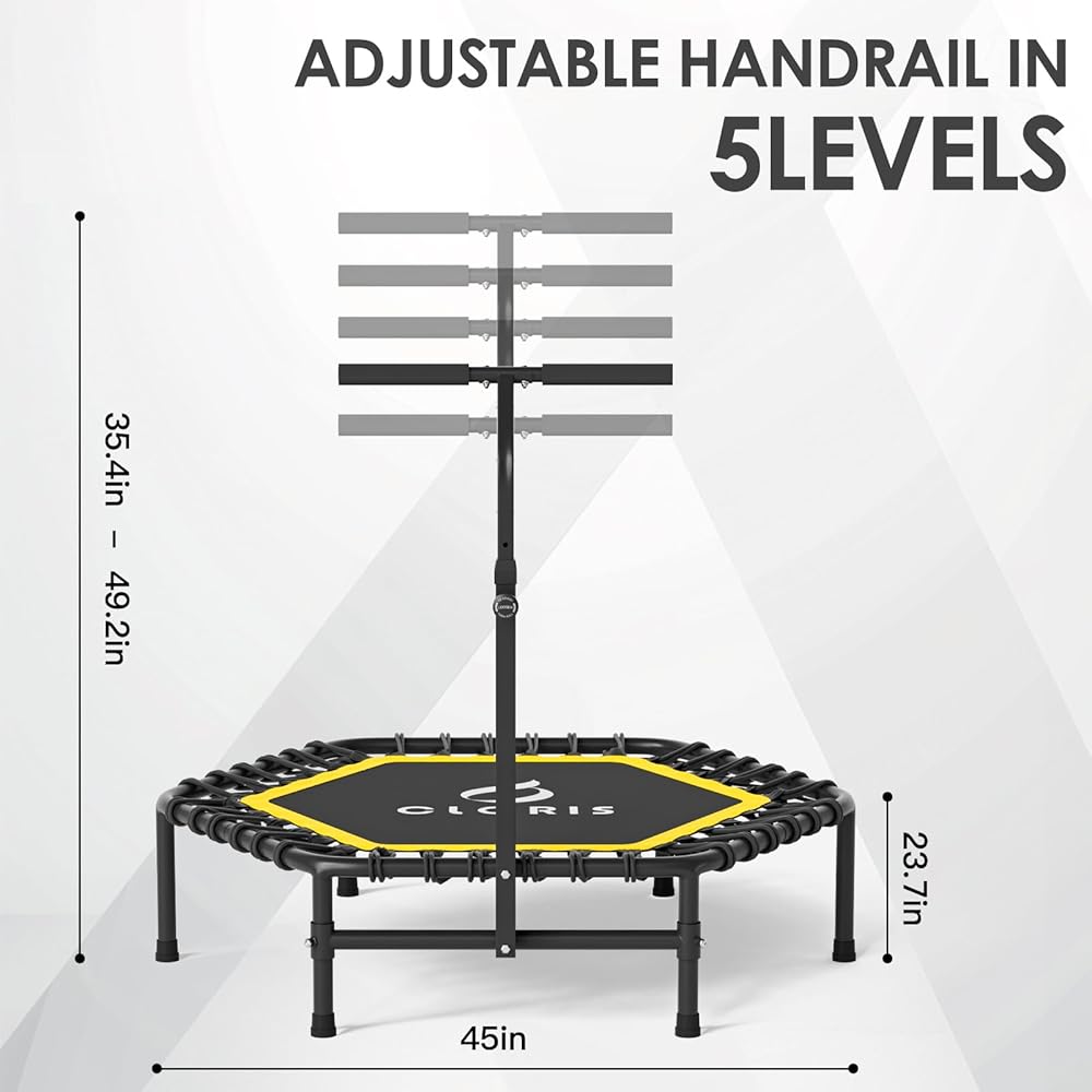 【5-level Adjustable Handle】The fitness trampoline equipment with a 5-level height adjustable handlebar. Jump with confidence