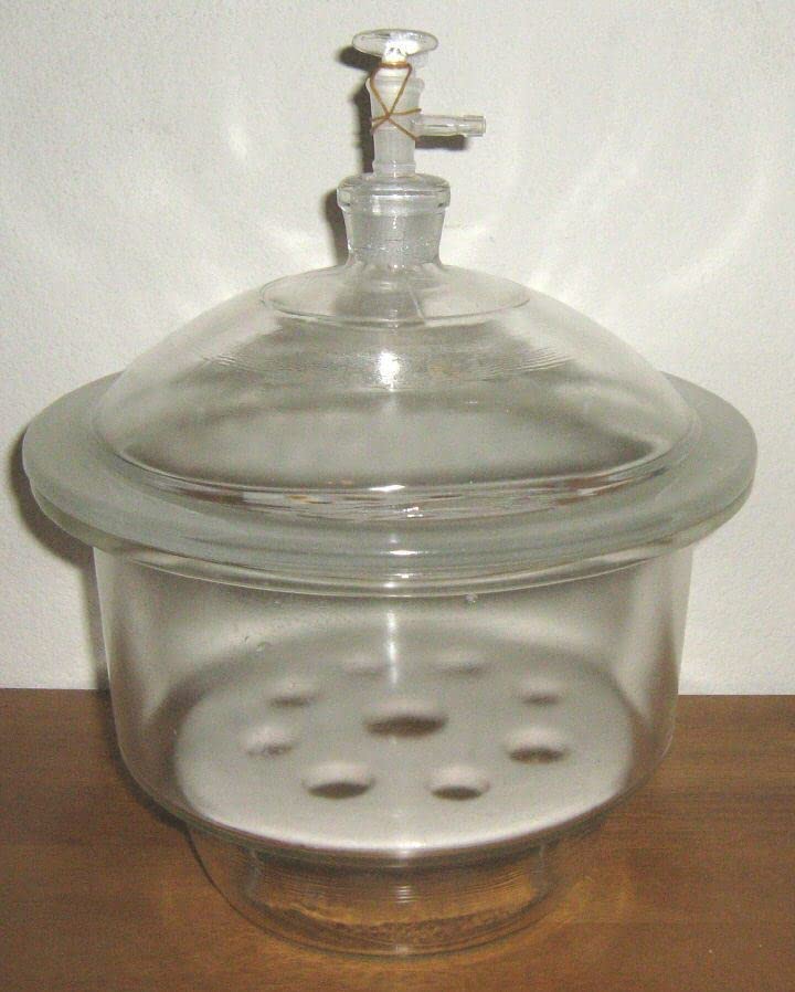 Glass vacuum desiccator. Includes glass ground stopper. Porcelain desiccator plate. Inner diameter 9" (240 mm).