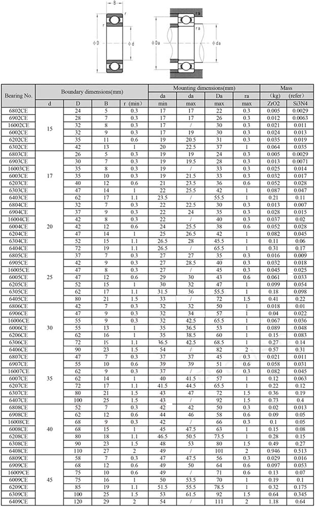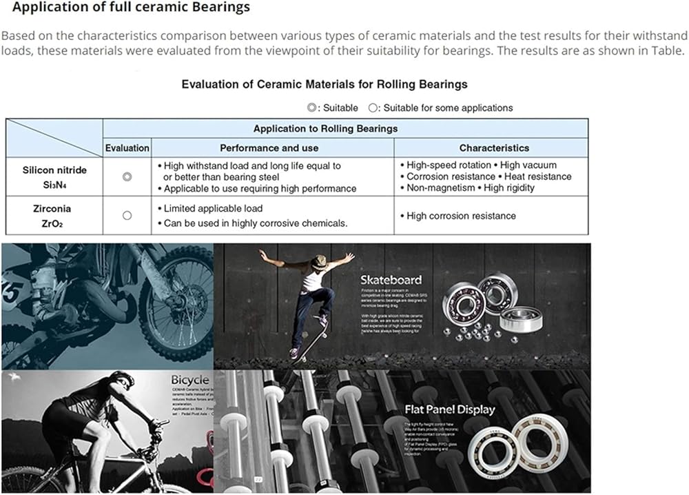 Full ceramic bearing made with Si3N4 have some better performance than ZrO2 the rings and balls made by full ceramic material:Si3N4 as a standard construction the cage made by PTFE Compares than the material of ZrO2 The SiN4 ceramics bearings could endure heavier load and could be used in higher temperature environment.