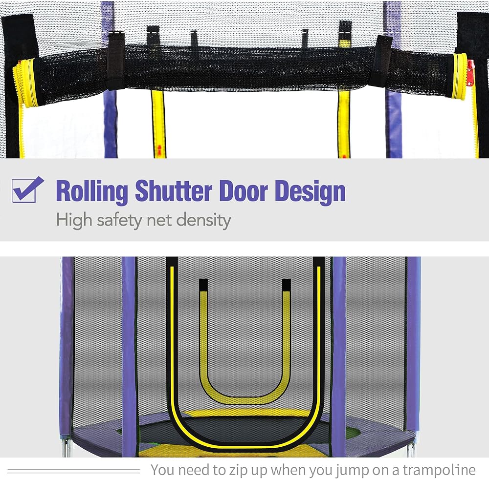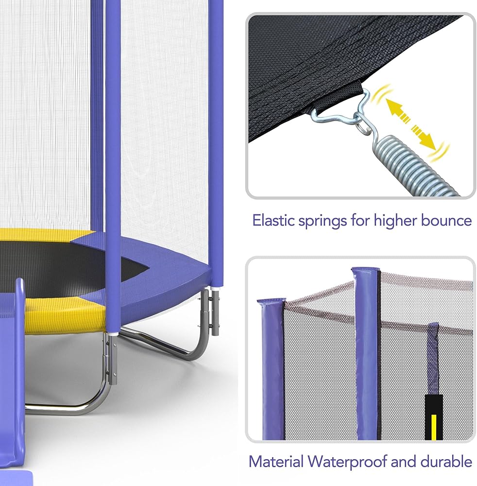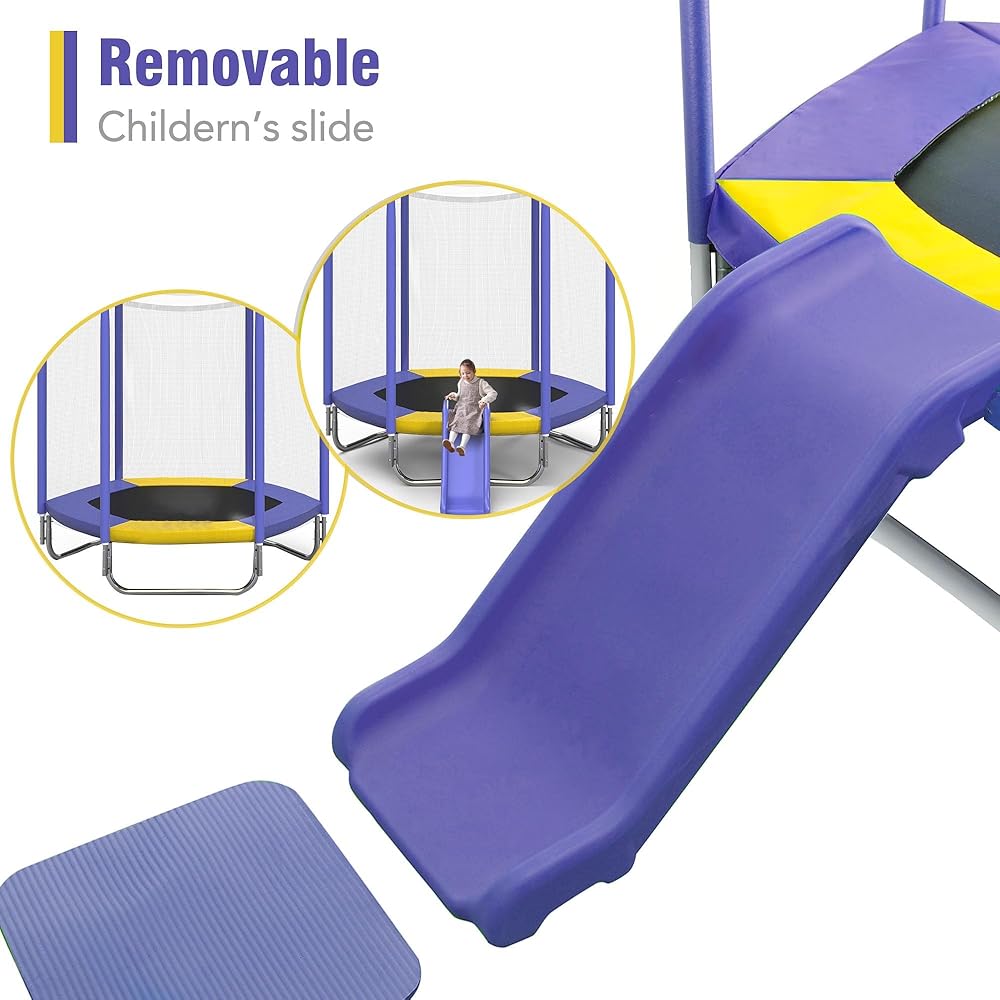 SAFETY IS KEY: Our kids trampoline prioritizes safety with a sturdy U-shaped steel frame, cushioned pad to cover all exposed metal and springs, a 5.3FT high zippered enclosure for secure play, and foam-covered poles to prevent accidental collisions. The slide has molded sides for hand protection, and a free cushion is included for a soft landing on the ground. We've got it all covered