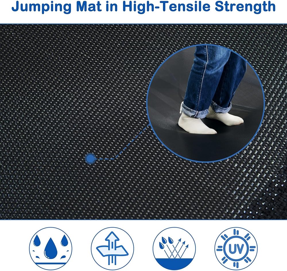 STAY ACTIVE: Built to withstand time and weather, our trampoline features a 360-degree enclosure net made of 100% high-strength polyester with an active UV additive to resist sun wear. The tightly-woven jumping mat and 36 high-tensile springs provide impressive bouncing capability and can handle a maximum user weight of 297lbs