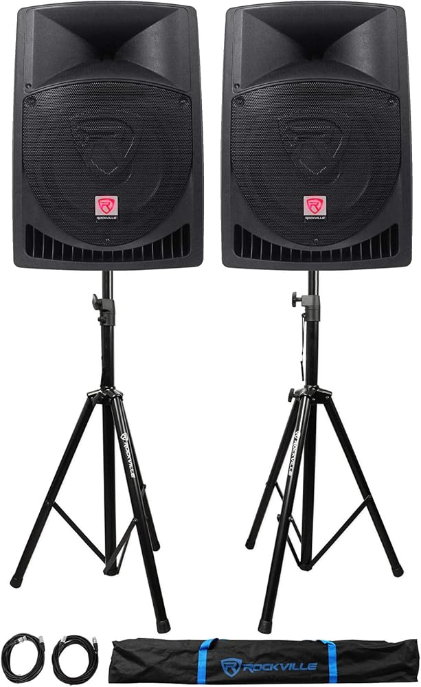 (2) Rockville RPG12 12" 1600 Watt Speakers. (2) Speaker Stands. (2) XLR Female to Male Cables. (1) Pair of Rockville Adjustable Tripod Speaker/Light Stands+(2) 20 Foot XLR Cables. Rockville RPG12 12" Active/Powered 800 Watts DJ/PA Speaker System. 200-Watt RMS / 400 Watts Program Power / 800W Peak. High power long-throw 12'' woofer with 2.5" aluminum voice coil provides incredibly deep bass and acoustic power. Frequency Response: 40Hz-20KHz. Flyable design with M8 threading for secure hanging.