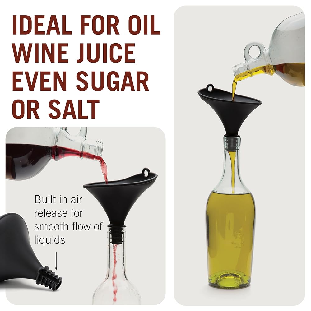 JUST PLUG IT IN: Say goodbye to drips, drops, and spills when refilling bottles. Our silicone flexible funnel uses a “Plug” design to make sure the silicone funnel stays securely in position and stable without needing to be steadied so you can keep both hands free for pouring