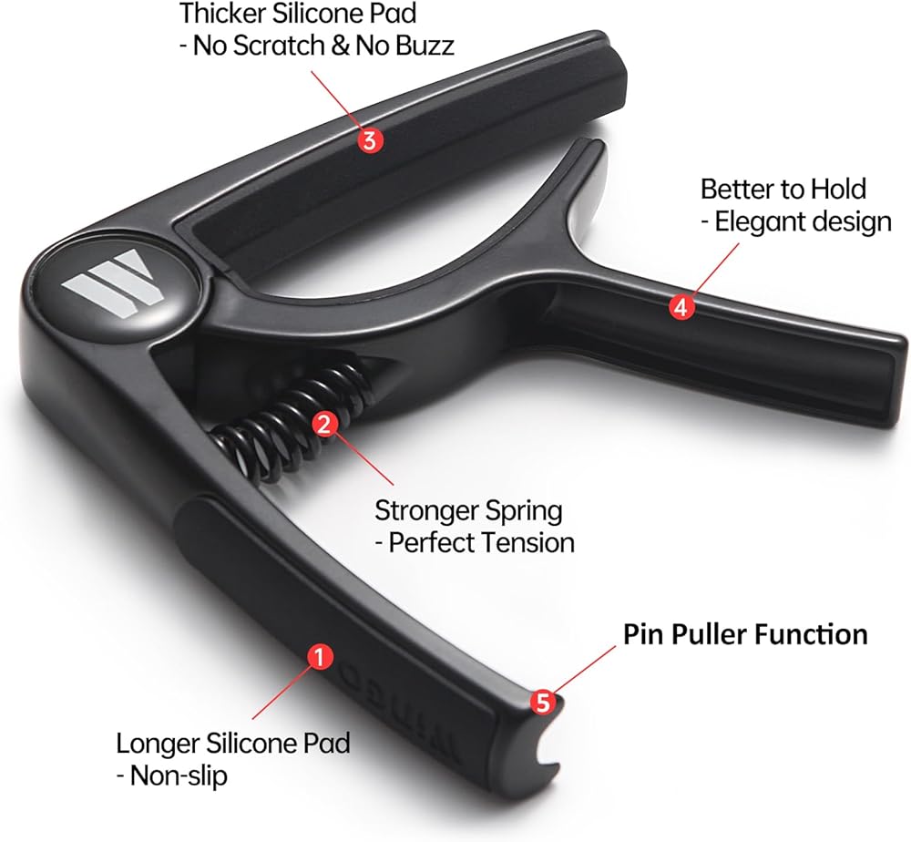 Well Made: High-Grade Zinc alloy material,strong built-in spring and silicone pads constructed capo protects your guitars from any scratches or damage. The handle with longer silicone pads make your hand holding more comfortable.