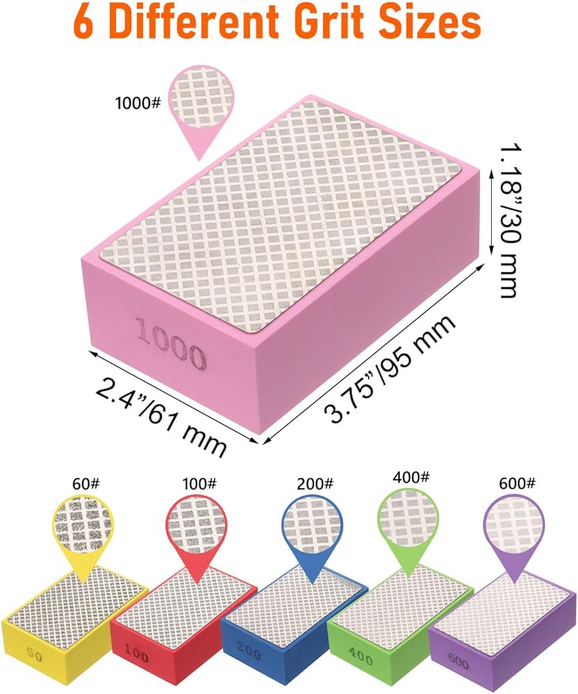 Multiple Grits: The diamond polishing pad set includes 6 grit sizes: 60#, 100#, 200#, 400#, 600#, and 1000#, catering to a wide range of needs from fast coarse grinding to fine polishing