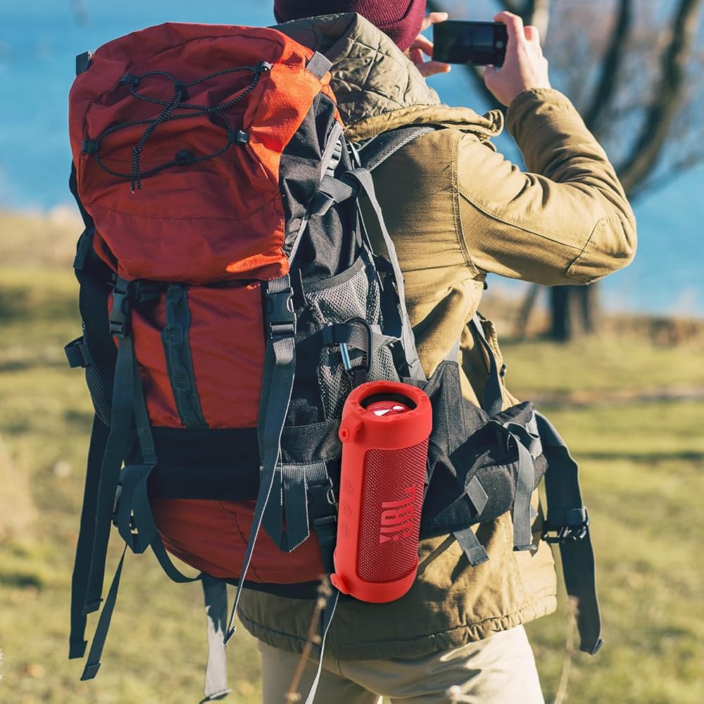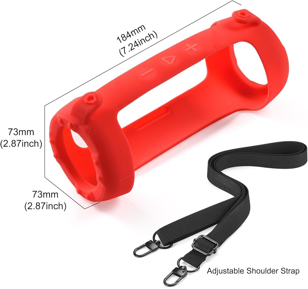 Silicone case designed specifically compatible with JBL Flip 7 Sized to fit,Easy to carry around on outdoor trips.Three color options available: Blue/ RED/ Black.Silicone case dimensions of about: 184*73*73mm / Inches: 7.24*2.87*2.87. Total length of unfolded shoulder strap about: 1500mm, 59.1inch