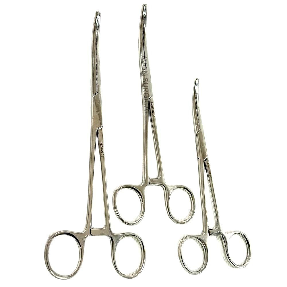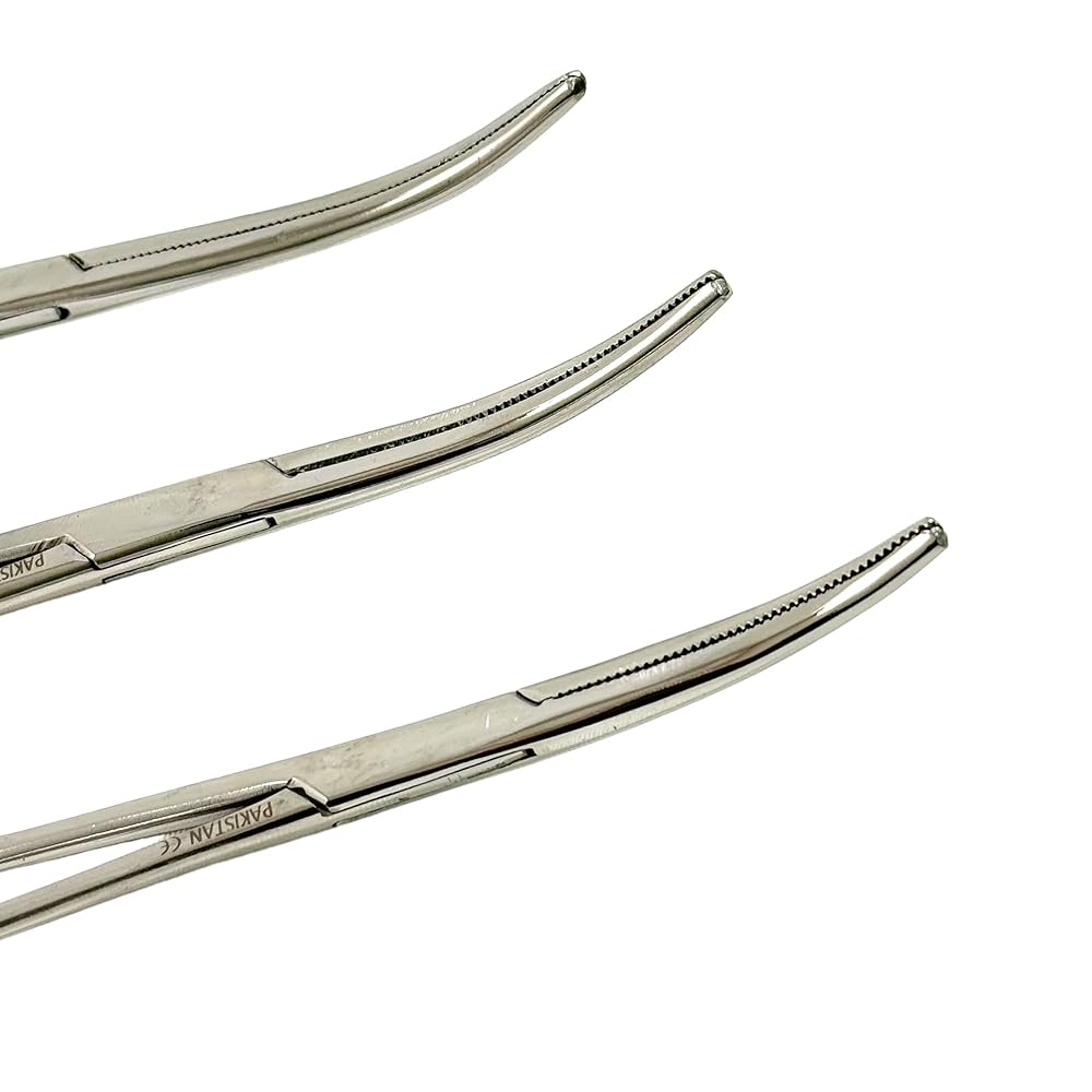 Set of 3 Pieces: Hemostat Forceps Curved with Ratchet Locking Mechanism, Serrated Tips, Includes Sizes 6" + 8" + 10" - Stainless Steel