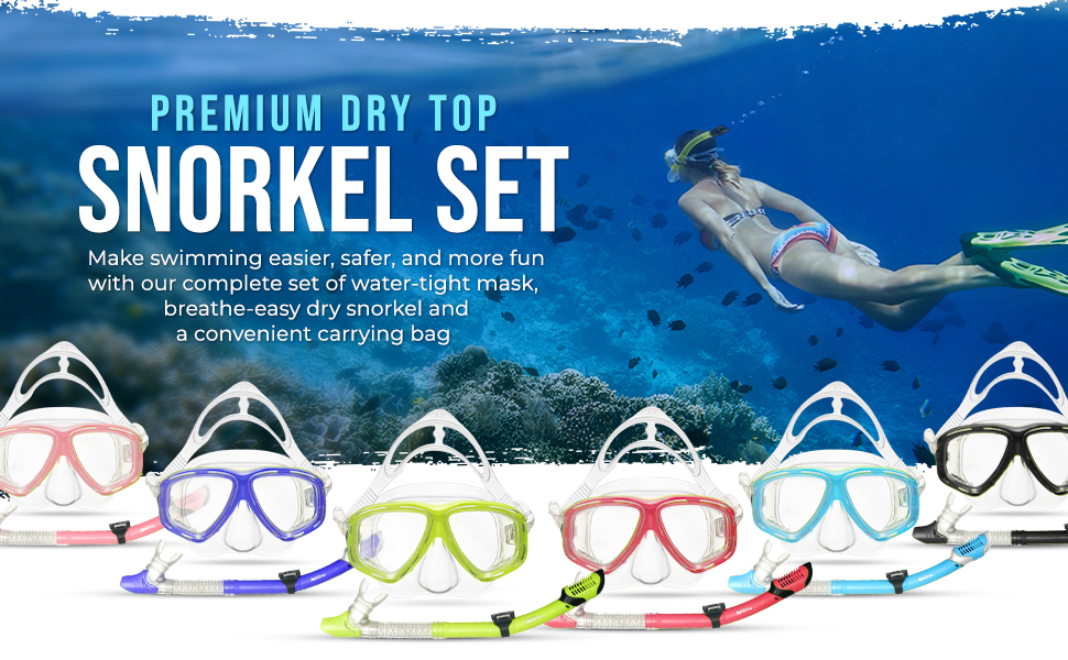 Full Snorkel Set for Adults: This adult snorkel set features a dry-top snorkel and a comfortable mask with an adjustable silicone strap; crafted for a snug watertight fit that enhances your snorkeling