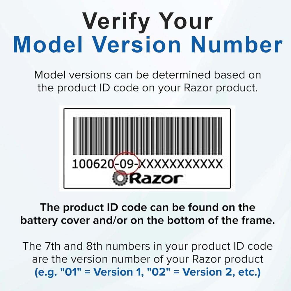 Your model version can be determined through your Razor product ID, which is typically located on the battery cover or on the bottom of the frame on a barcode sticker. The 7th and 8th digits correspond to a version number (e.g. 01 = version 1, 02 = version 2, etc.).