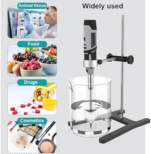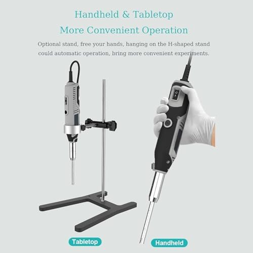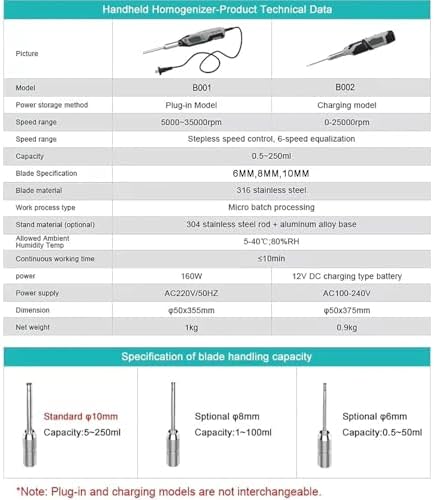 Introducing our High-Speed Homogenizer, designed for both professional and home use, making it an essential tool for anyone who values precision and efficiency in liquid processing. With two models to choose from, you can select the perfect power source to fit your needs: the B001 model is powered by a 220V AC plug, while the B002 model features a rechargeable 12V lithium battery, offering flexibility for various environments. This homogenizer operates at impressive speeds of up to 35,000 RPM (B001) or 25,000 RPM (B002), enabling you to achieve ultra-fine emulsions and consistent mixtures in micro-batch processing. The stepless speed regulation allows you to fine-tune the speed for specific applications, making it suitable for everything from culinary use to laboratory experiments. Equipped with three interchangeable 316 stainless steel heads (10mm, 8mm, and 6mm), this tool accommodates a range of liquid processing volumes, from 0.5 to 250ml. Its robust design ensures durability while providing superior performance in blending, emulsifying, and dispersing liquids. Whether you're a food enthusiast experimenting in your kitchen, a researcher needing precise emulsions for experiments, or a small business owner creating unique formulations, this homogenizer is your go-to solution. With a compact size and lightweight construction, it's easy to handle and store, fitting seamlessly into any workspace. The High-Speed Homogenizer comes complete with an H-shaped stand for stability, ensuring safe and effortless operation. Each package includes the homogenizer, three heads, a stand, and comprehensive instructions to get you started right away. Transform your liquid processing tasks with our High-Speed Homogenizer—where quality meets convenience. Discover the difference it can make in your projects today!