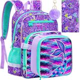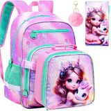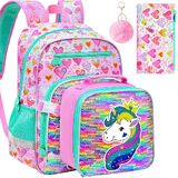 Girls Unicorn Backpack Set: Girls backpack with cute unicorn pattern, including girls bookbag:12"(l)x16"(h)*5"(w), lunch bag: 8.5"(l)*9.5"(h)*4"(w), pencil bag: 8.66"(l)x4.72"(h)*0.2"(w).