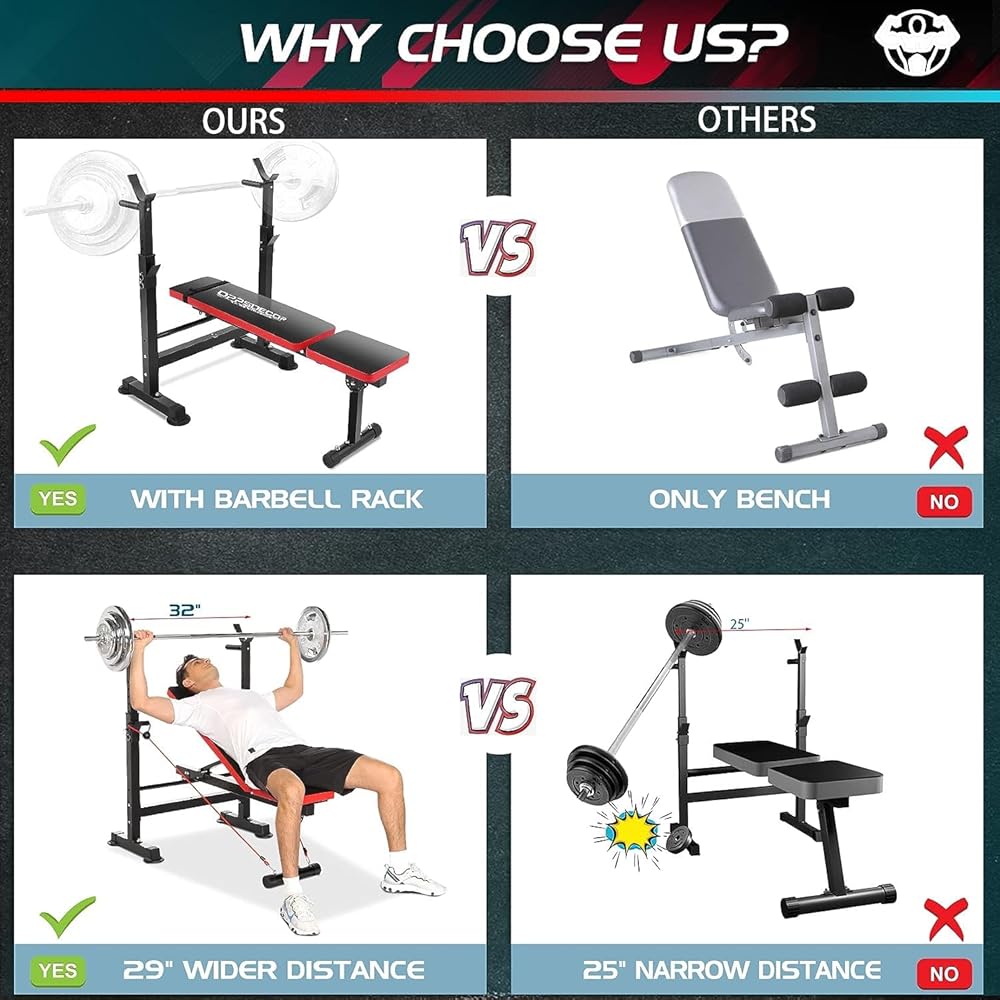 【Easy To Assemble】The weight bench set is easy to assemble, and all required accessories are included. Overall dimension: 53” L x 31” W x 38.6-50.4”H. Please note that weight plates and barbell are not included.