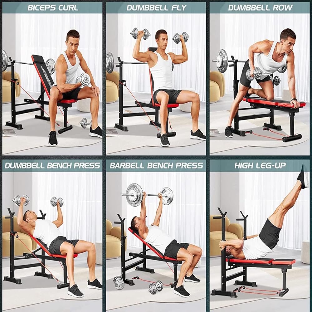 【Adjustable Weight Bench】This weight bench set has 4 adjustable backrest positions and 4 adjustable peracher curl. The barbell rack can be adjusted to 6 different levels. Meet all your needs when you exercise.