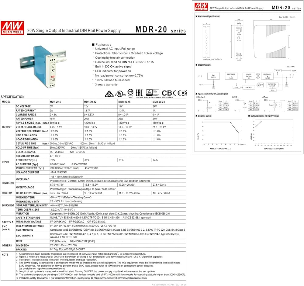 • Reliable 12V Industrial Power: The MDR-20-12 delivers 12V at 1.67A, totaling 20W of power. This UL-certified power supply features short circuit, overload, and overvoltage protection for enhanced reliability.