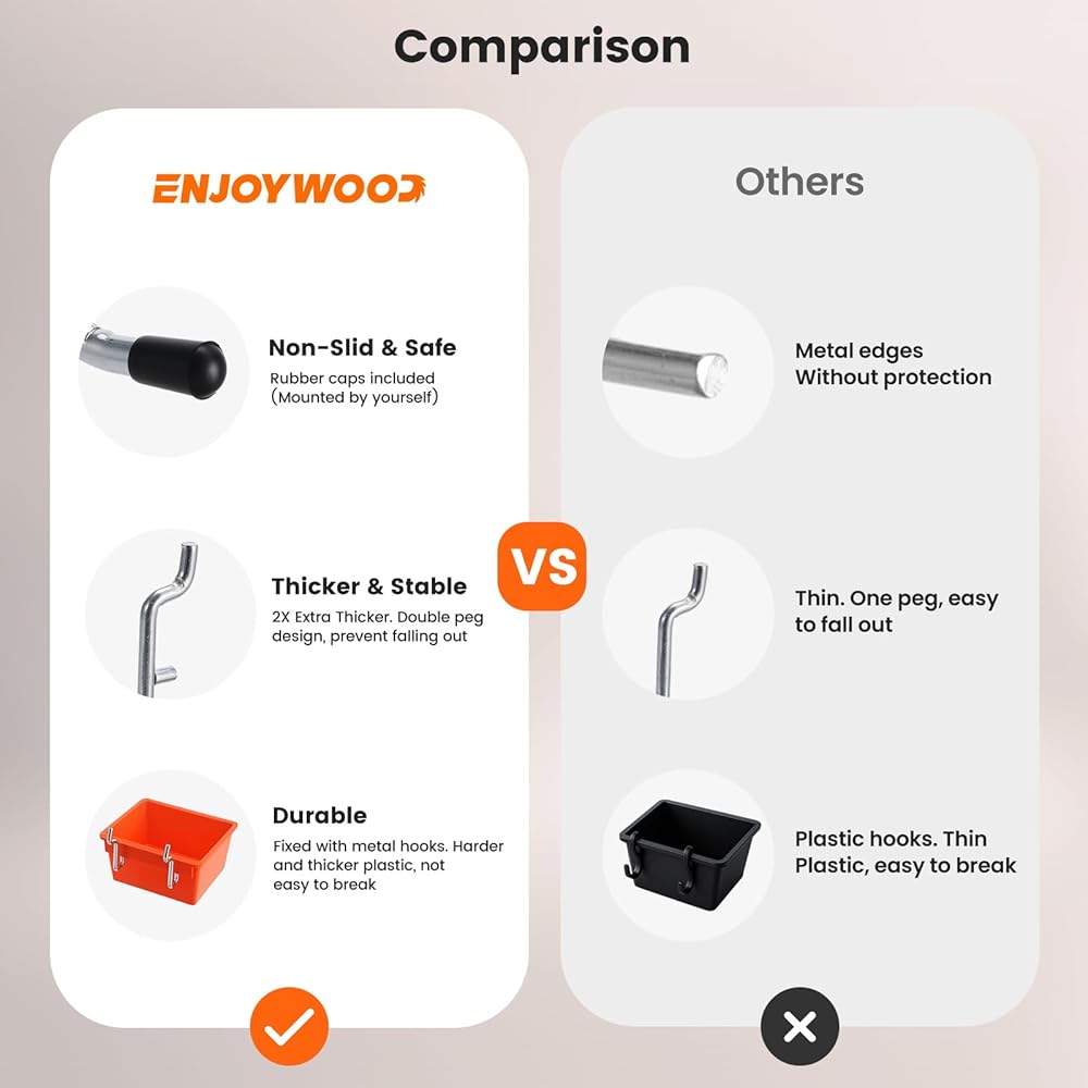 Fits Φ1/4" standard pegboard: The thickness of ENJOYWOOD peg board hooks is 0.2". Pegboard accessories are suitable for 1/4 inch metal and non-metallic pegboards with a spacing of 1 inch.