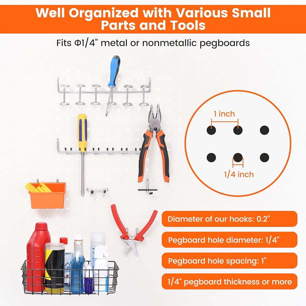 Orderly & Space-Saving: These multi-functional peg board tool hangers can be used in combination with pegboard bins, storage cups, and wire baskets. Arrange them compactly according to your needs, save more space, and allow you to easily access various tools without having to search for items in the clutter
