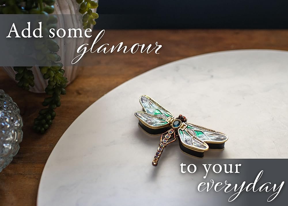 Cottage Garden Hand Painted Metal Enamel Hinged Trinket Box Ornamental Mini Jewelry Ring Earring Organizer Vintage Collectible Figurine Keepsake Box with Bejeweled Crystals, Green Dragonfly