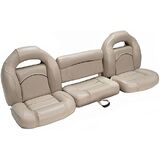 68" Bass Boat Bench Seat Package Driver and passenger side two-piece bucket seats Back and seat cushions attach separately Each bucket seat measures 22" wide 24" wide center fold down seat w/ hold down strap Center seat folds flat and is designed as a step Factory Grade Replacement Seats 3 year full replacement warranty on upholstery 30oz soft to the touch, marine grade seat vinyl Custom molded foam cushions won't break down Plastic frames with 100% stainless steel hardware All mounting hardware is included (stainless)