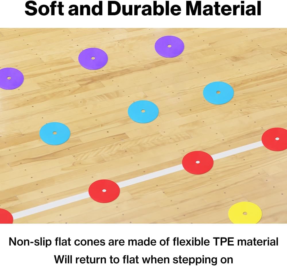 Various Usages For Indoor & Outdoor Activities: Flat cones are available on various situations, such as speed agility training, team sports, soccer, basketball, gym, classroom, playground, party and children's playing