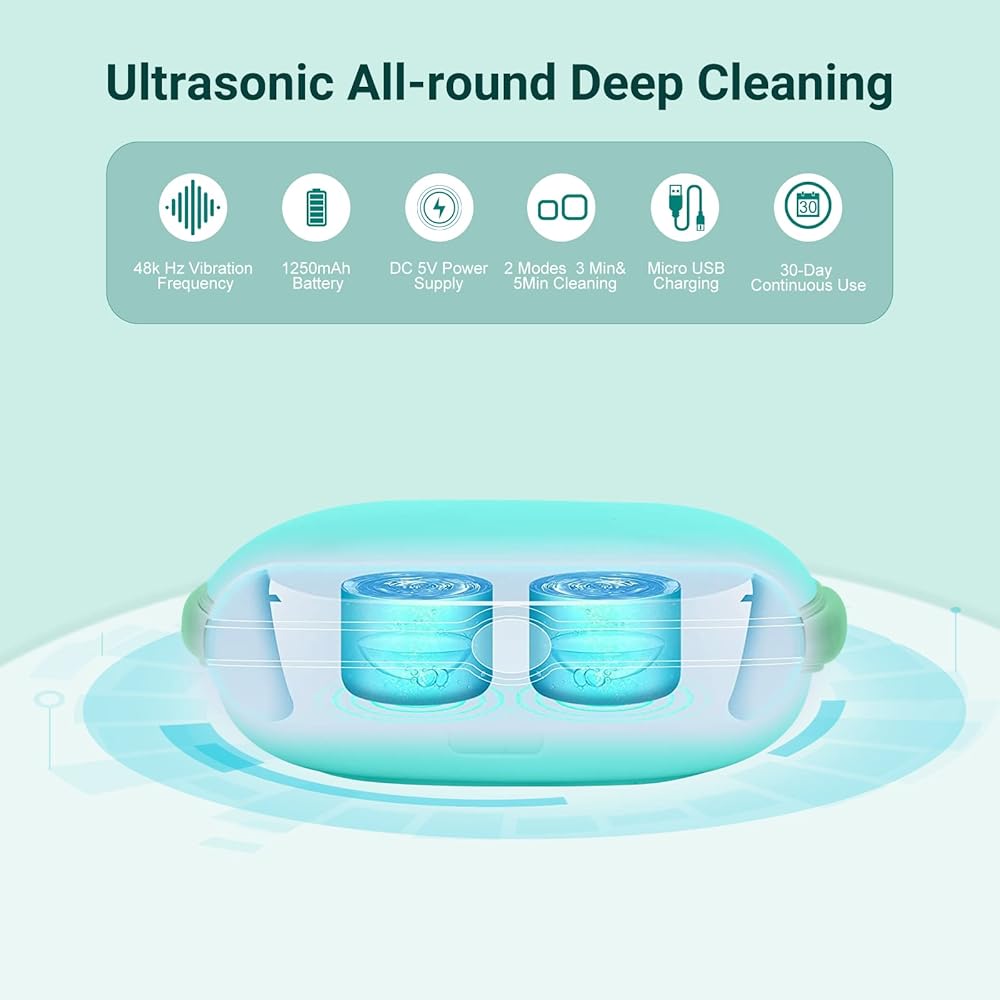 تنظيف فعال وسريع - يعتمد على تقنية الاهتزاز السريع عالية التردد، سيزيل منظف العدسات اللاصقة بالموجات فوق الصوتية البروتينات والدهون والبلورات التي تحجب المسام المنفذة في فترة زمنية قصيرة.