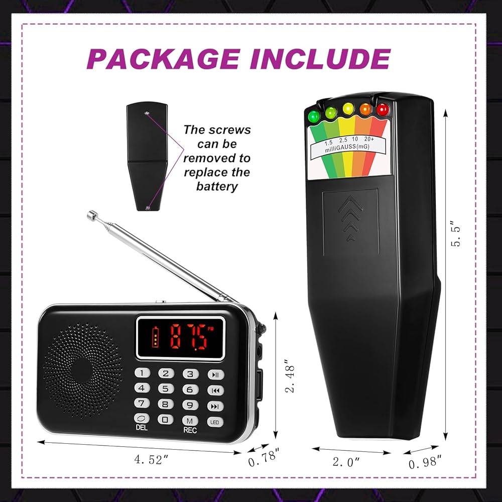 Size: radio 4.52 x 2.48 x 0.78 inch/11.48 x 6.3 x 1.98 cm, EMF Meter 5.5 x 2 x 0.98 inch/13.97 x 5.08 x 2.49 cm