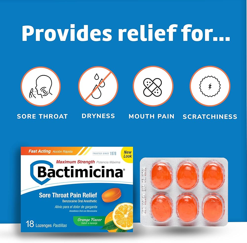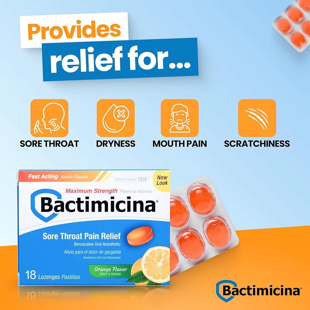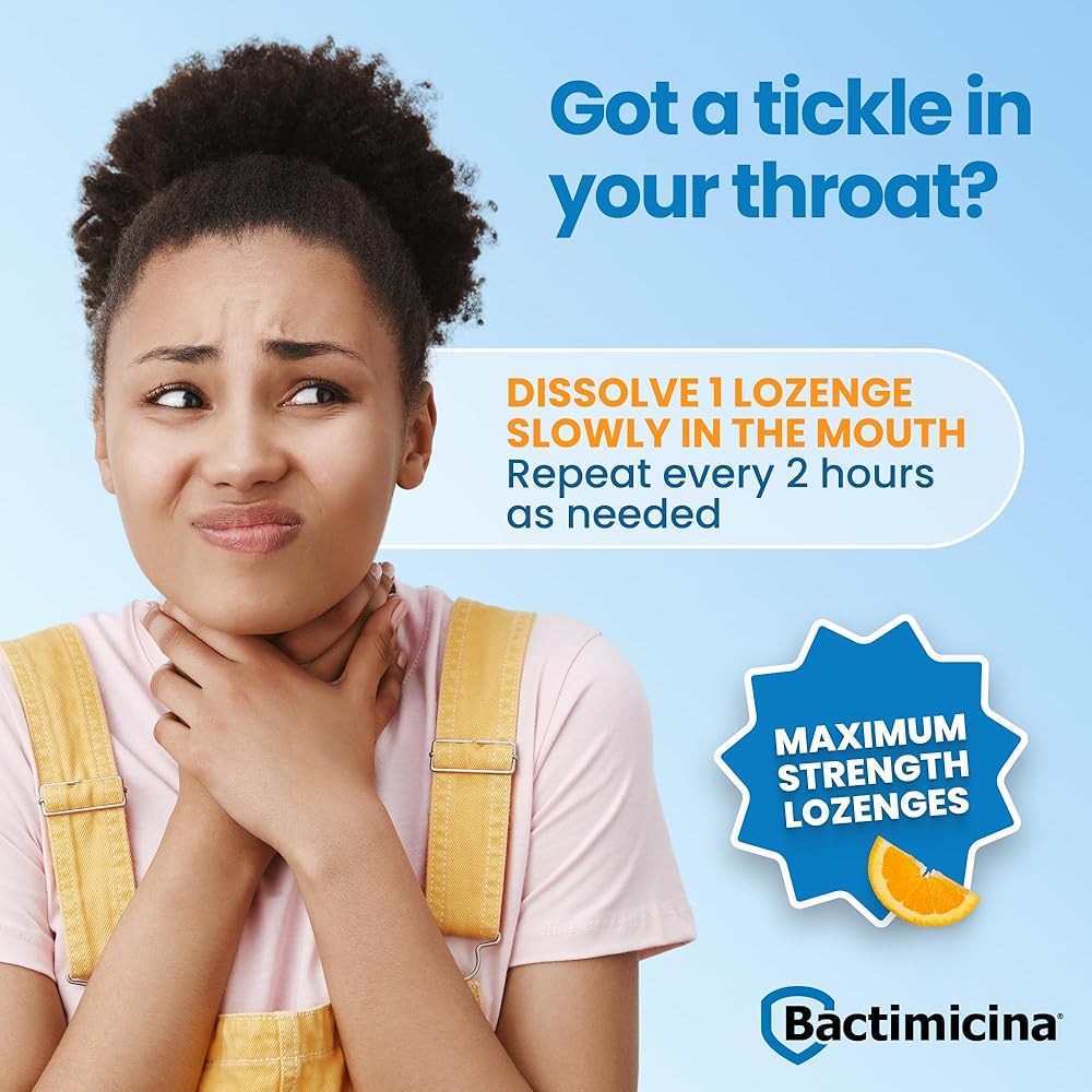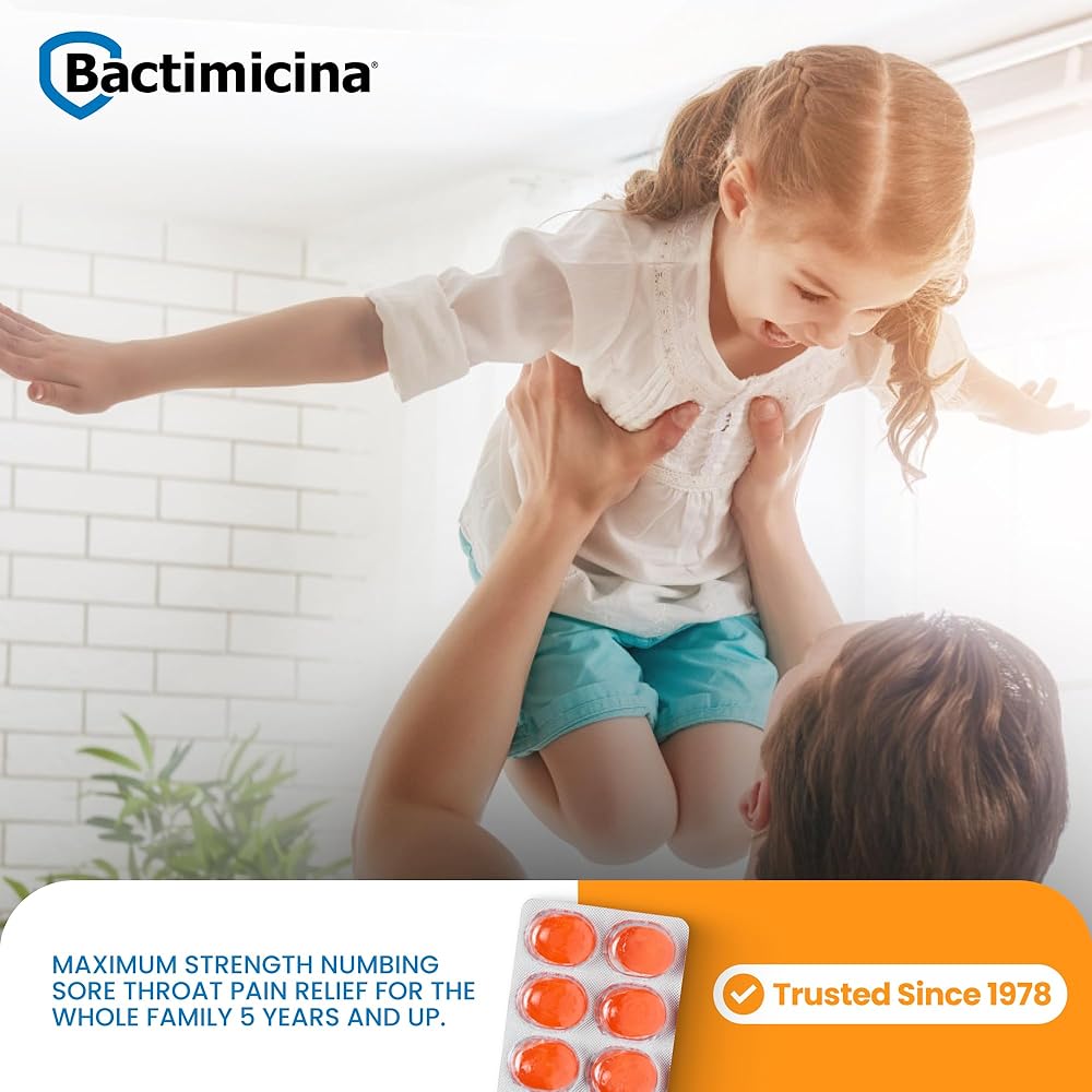 Bactimicina Sore Throat Lozenges provide fast action sore throat relief, As soon as you feel a tickle in your throat, take 1 lozenge and experience the maximum strength formula instantly.