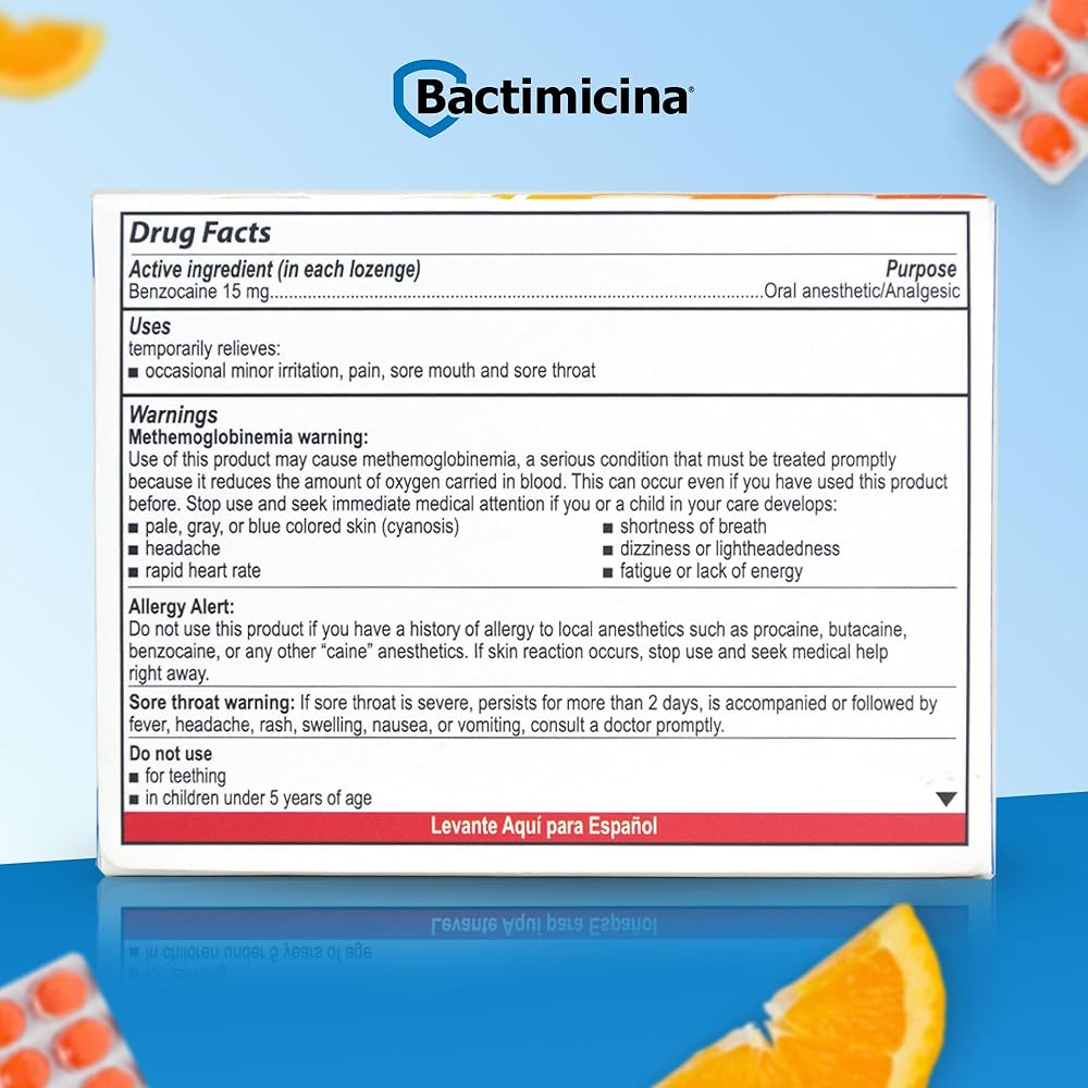 Great tasting lozenges without menthol! Bactimicina orange flavored throat lozenges are ideal for the entire family ages 5 and up.