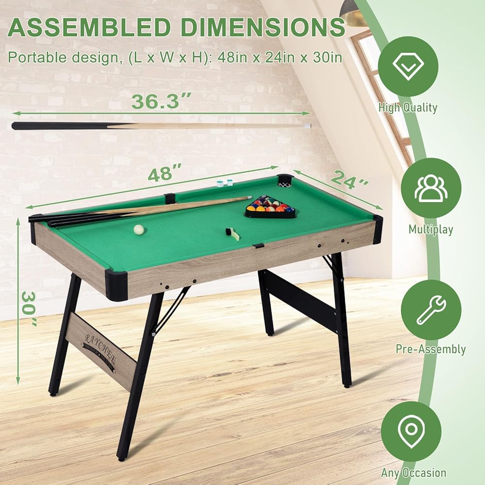 Portable Size & Excellent After-Sales Service: The size of this pool table is 48 " X 24 " X 30" and light weight. The folding pool table set is very portable. Free replacement or parts guarantee for any quality problem, Satisfaction guaranteed. CONTACT US: Login to your amazon account > choose "Your orders"> find the order ID > click "Contact seller".