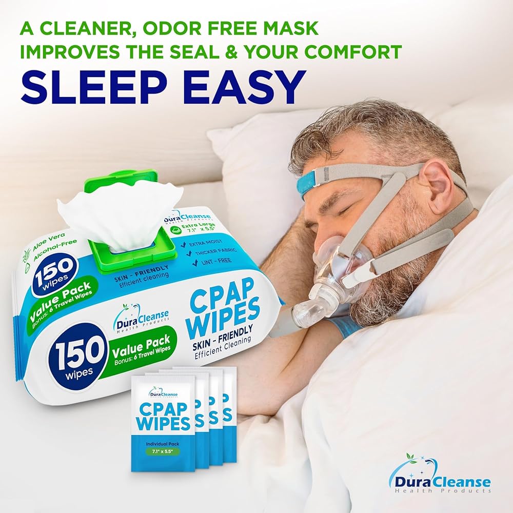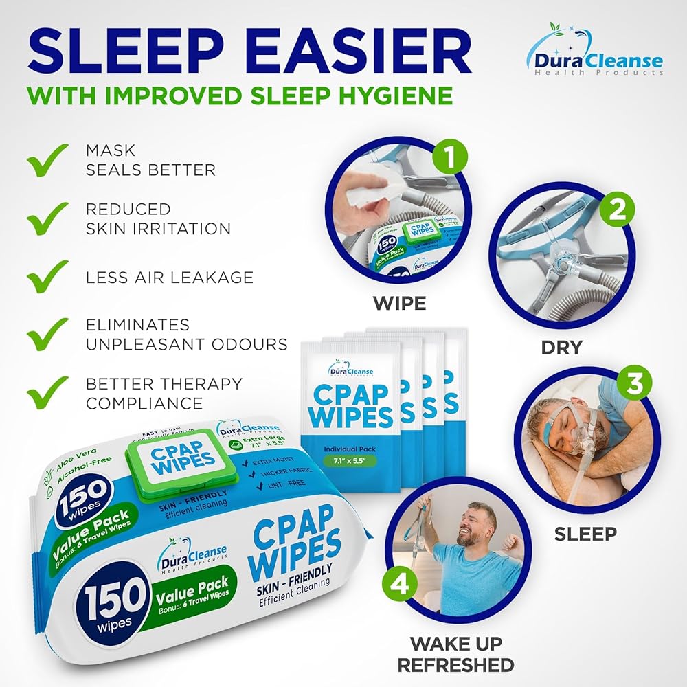 SLEEP BETTER WITH A CLEANER SLEEP MASK Duracleanse Wipes are specifically formulated for sleep masks, tubes, and accessories. Designed to gently and completely clean plastic and silicone surfaces without leaving any lint, residues, or particles. LARGE AND DURABLE SHEETS Made of 30% viscose and 70% polyester non-woven fabric that is soft and sturdy and measures at ~7.1 x 5.5 inches. You only need a single wipe to clean your mask daily. Each wipe eliminates dirt and oils from the mask without harming it. SKIN-FRIENDLY FORMULATION Aloe vera extract gives a gentle, natural fragrance, and it's alcohol-free, so it won't dry or irritate your skin. Designed to effectively remove oil and dust from the equipment without damaging your mask. THE BEST WAY TO CLEAN YOUR SLEEP MASK DAILY Without soaking in soap, water, or vinegar, clean your sleep mask and tube every day. Duracleanse wipes clean effectively without causing excess wear or leaving odours / residues. Your mask will seal and smell better, allowing you to get the most out of your sleep treatment. ON-THE-GO TRAVEL SLEEP WIPES Duracleanse Wipes come in individually packed sachets that fit neatly into a handbag or travel bag, unlike bulky canisters.