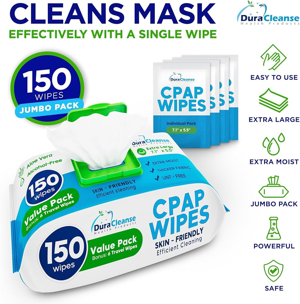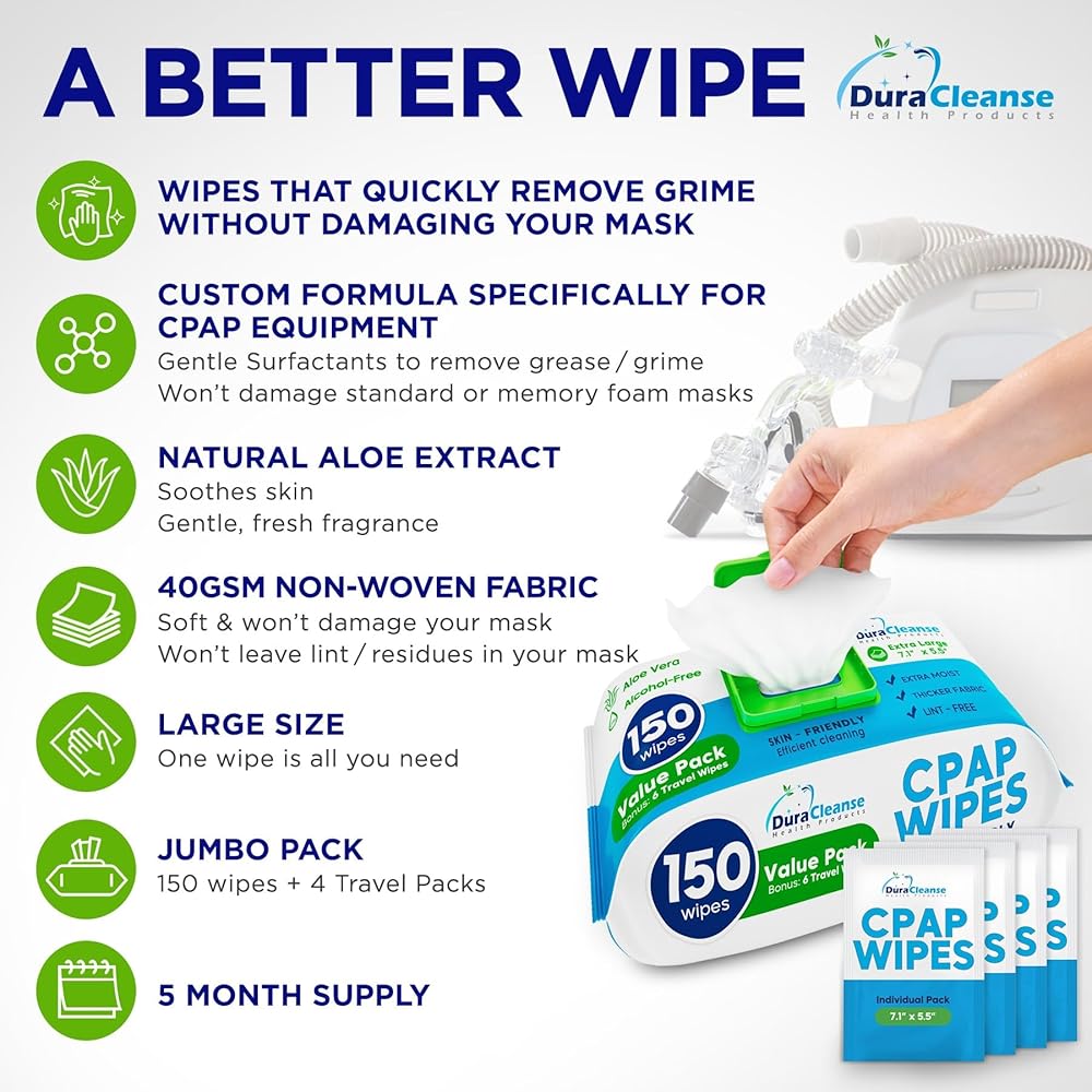5-Month Supply: Contains 150 pieces of CPAP Mask Wipes that you can use every day for 5 months to sanitize your CPAP or BiPAP mask so you can sleep better and wake up refreshed & well-rested. Get 6 additional individually packed wipes for quick on-the-go packing.