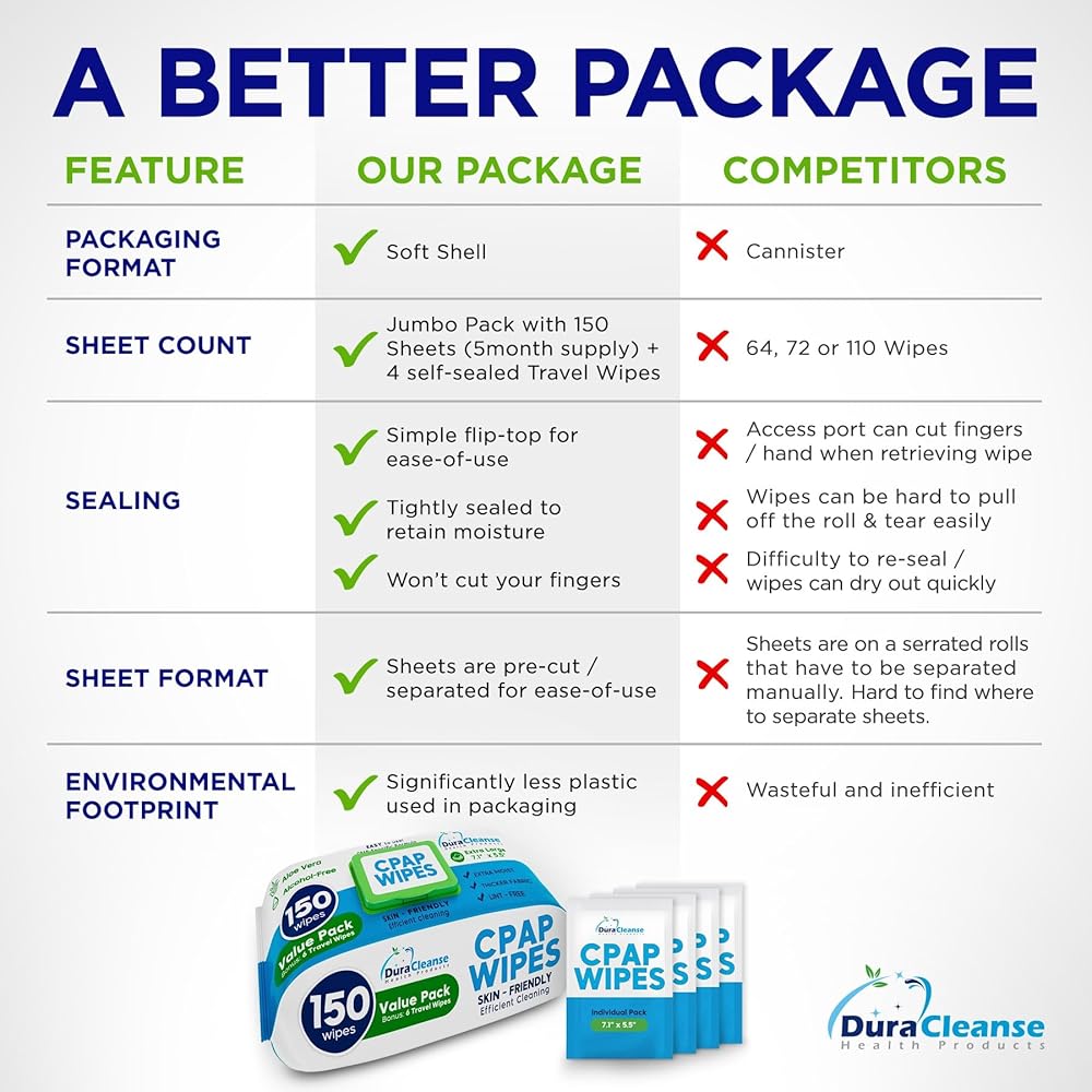Efficient Cleaning Method: Easily clean CPAP mask and tube daily without soaking in soap, water & vinegar. Duracleanse wipes clean efficiently without the need for constant rinsing that leads to deterioration & signs of wearing. This means your mask seals better so you get the best therapy.