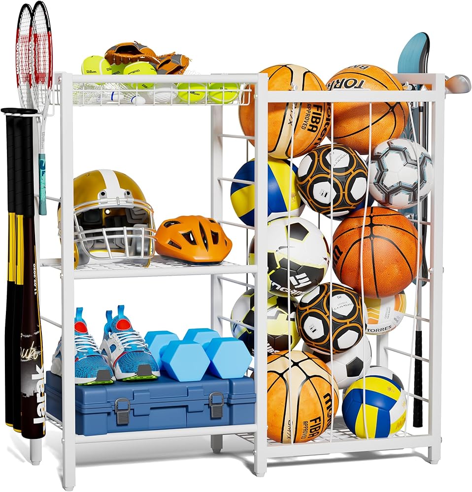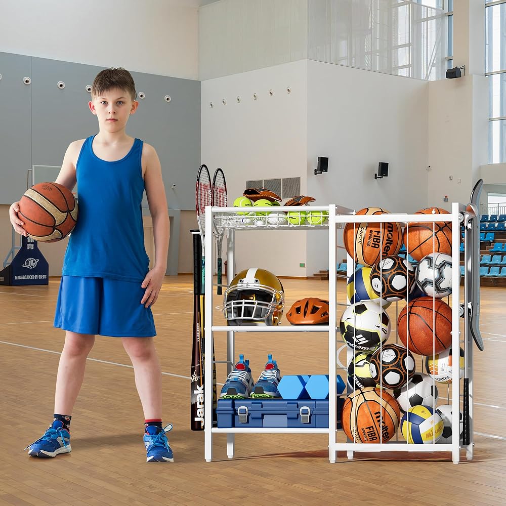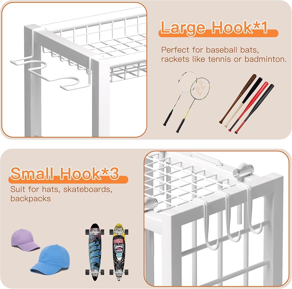 Multi-Function Hooks: Equipped with 2 types of hooks, this sports equipment organizer is versatile enough to hang baseball bats, badminton and tennis rackets, as well as items like hats, skateboards, and backpacks. The hooks provide additional storage options, making it a practical all-in-one solution for organizing your gear. Whether you need a basketball rack or volleyball cart, this organizer has you covered
