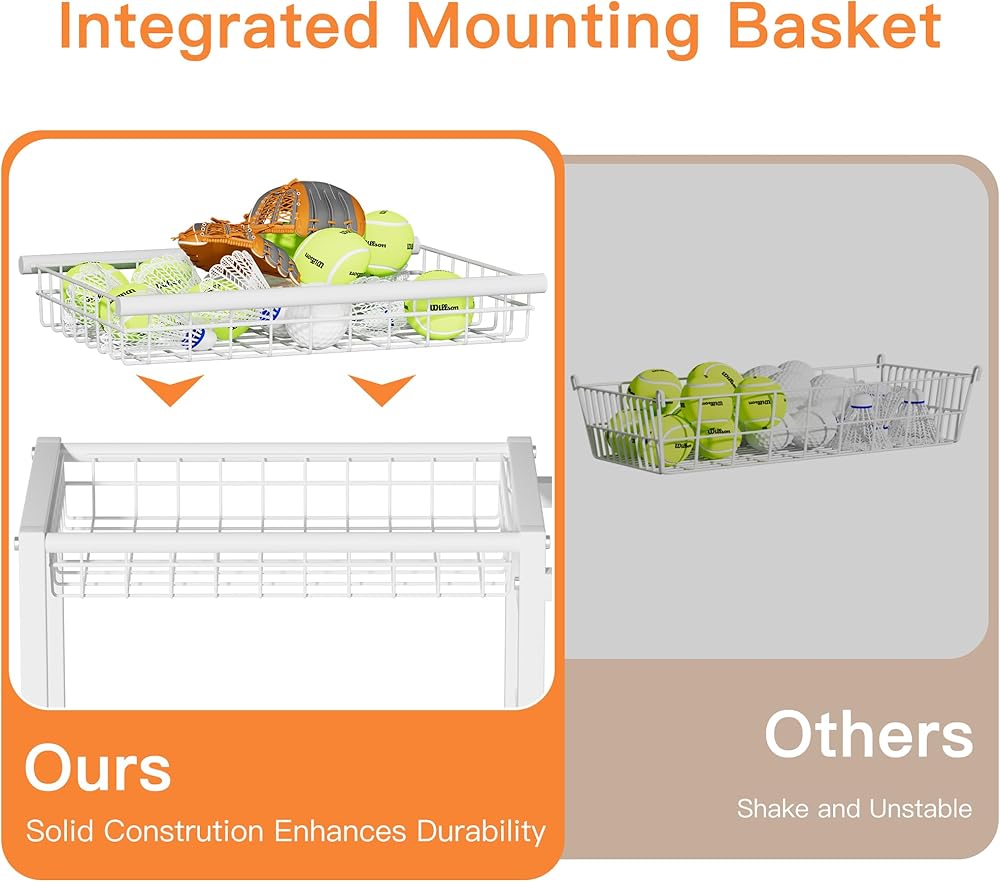 Removable Metal Basket for Small Items: Our ball storage solution includes a detachable metal basket at the top, ideal for storing smaller balls like tennis balls, baseballs, ping pong balls, and badminton shuttlecocks. The storage basket is also great for organizing small items like baseball gloves or children's toys, making it easy to manage clutter anywhere you need. Perfect for garage toy storage and ball rack, this feature keeps everything tidy and accessible