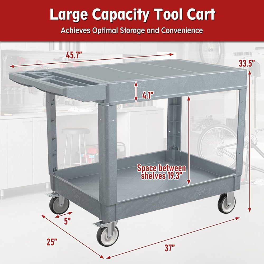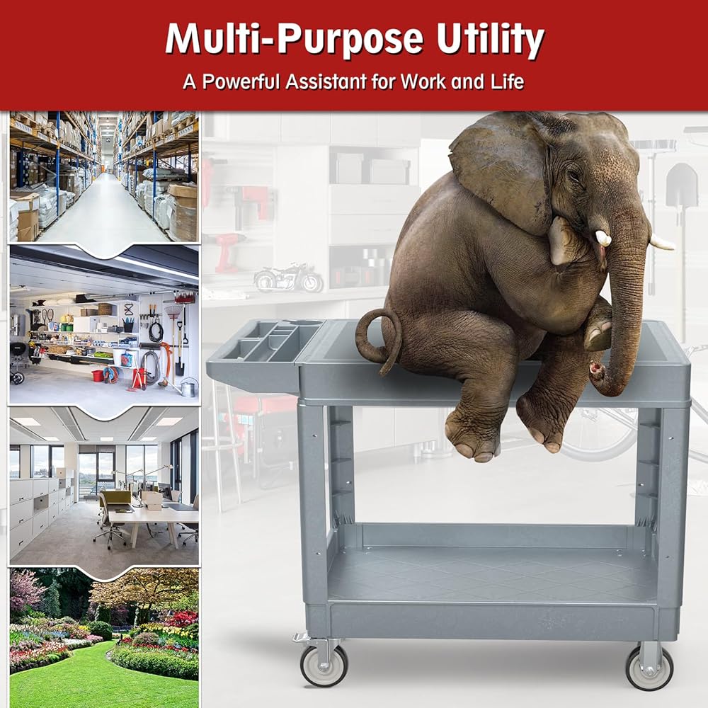 【Widely Used】--This work cart is a must-have for a wide range of settings. It's perfect for warehouses, classrooms, garages, offices, IT hubs, cleaning crews, gardeners, filmmakers, and any place where you need to store and transport items with ease. Rest assured, this cart is built to withstand various environments without a hitch, making your tasks more convenient and efficient.