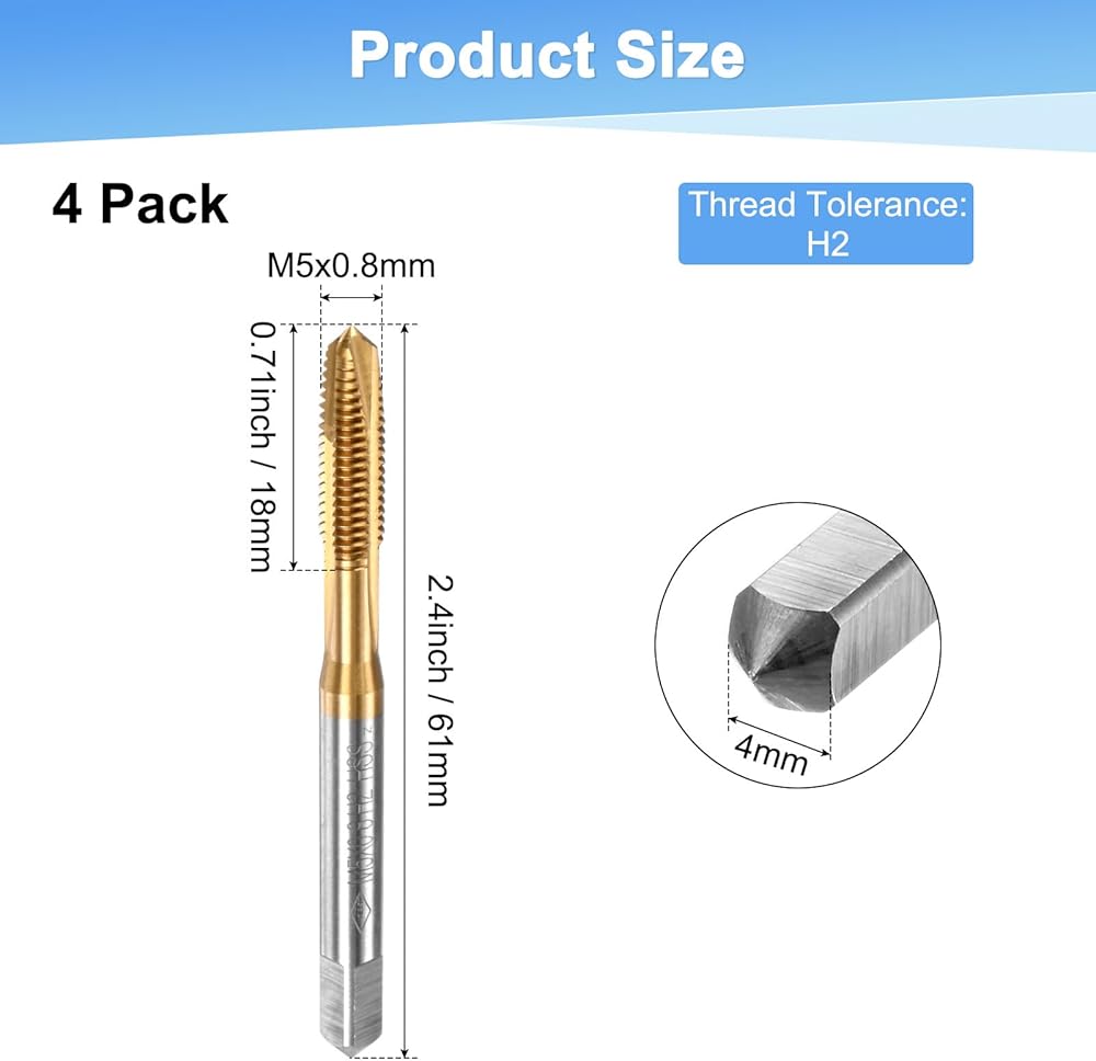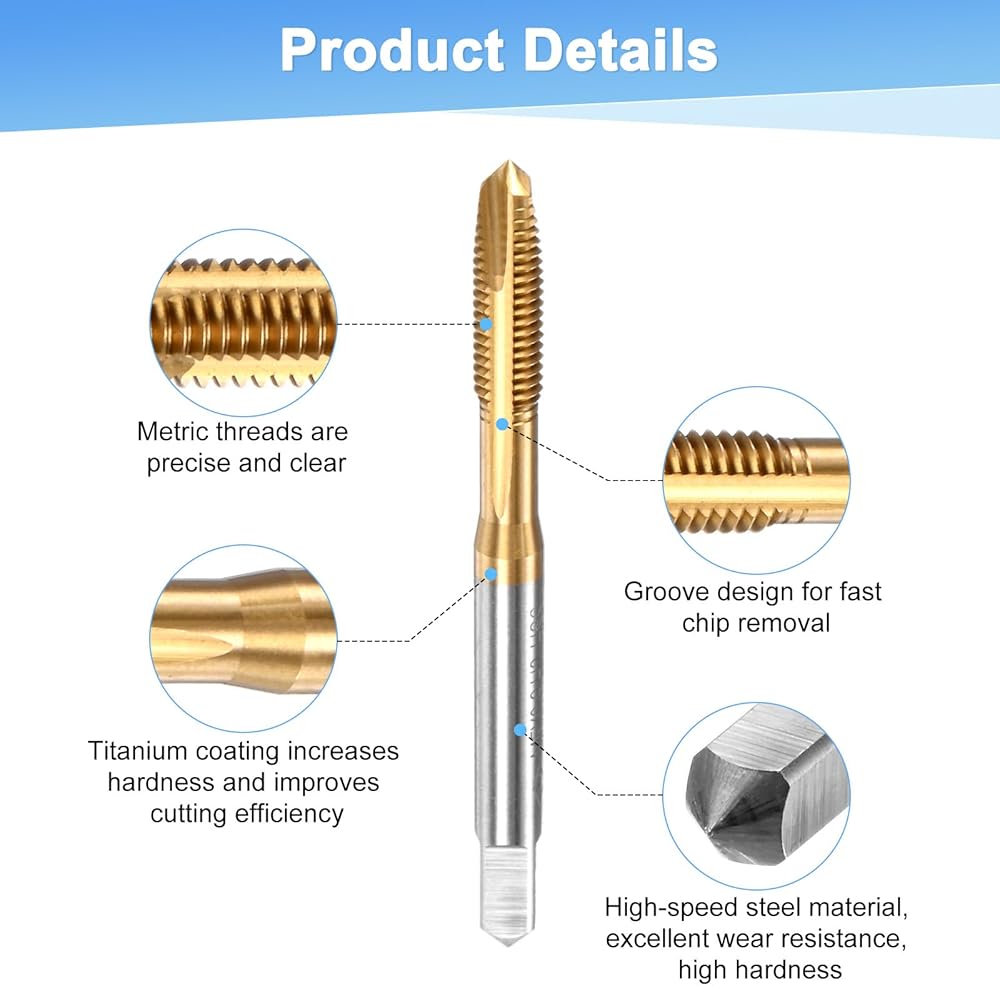 1. The thread taps are made of premium high-speed steel, with excellent wear resistance, high hardness and good cutting effect. The titanium coating on the surface increases the surface hardness of the taps, reduces the adhesion of metal materials to the taps, and improves cutting efficiency.