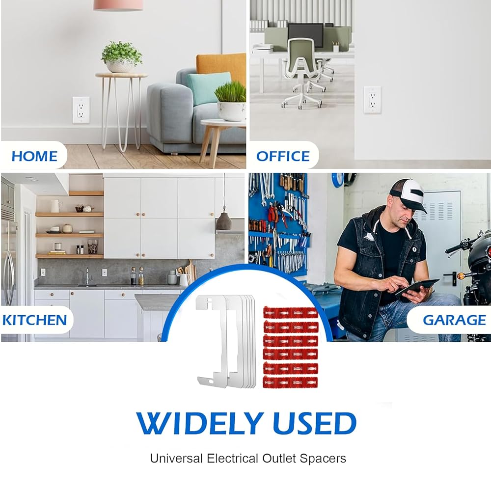 Metal & Plastic Spacers Crafted from quality metal with rustproof/waterproof properties and robust plastic material with moisture resistance. Metal spacers fix loose/bent/recessed sockets while plastic spacers prevent switch sagging. Both ensure flush installation and long service life for standard single-socket devices. 2.Versatile Use Across Multiple Spaces:The pack includes enough metal and plastic spacers to meet all your outlet repair needs. They are highly applicable and can meet the majority of your wall outlet fixing requirements for various locations such as bedrooms, living rooms, bathrooms, offices, and laundry rooms