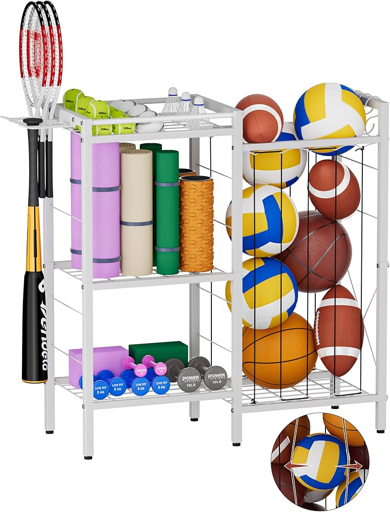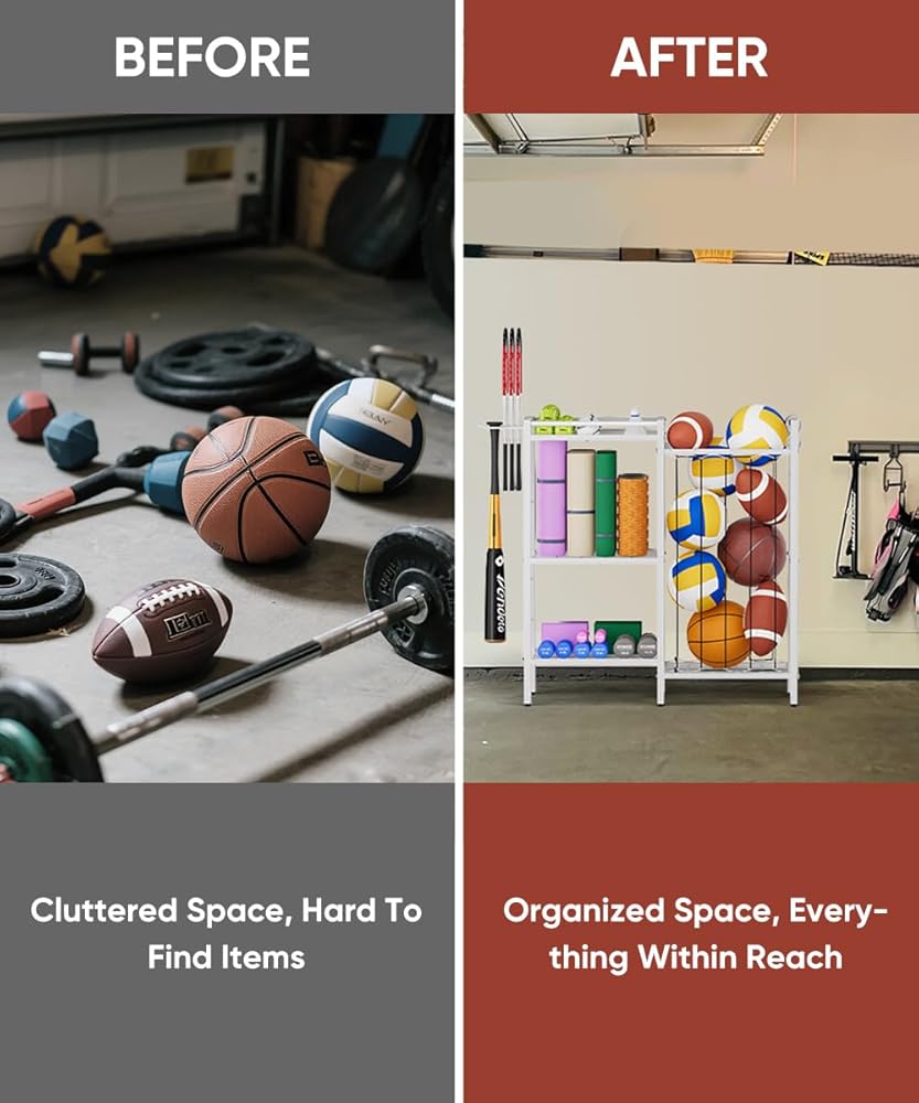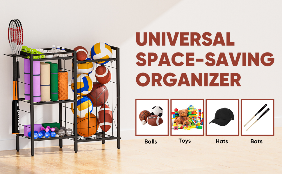 HEAVY-DUTY METAL FRAME: Engineered with premium-grade steel, this exercise equipment storage withstands daily use in garages, gyms, schools, or playrooms. Its rugged build supports substantial weight without bending, ensuring years of reliable service while keeping your space tidy.