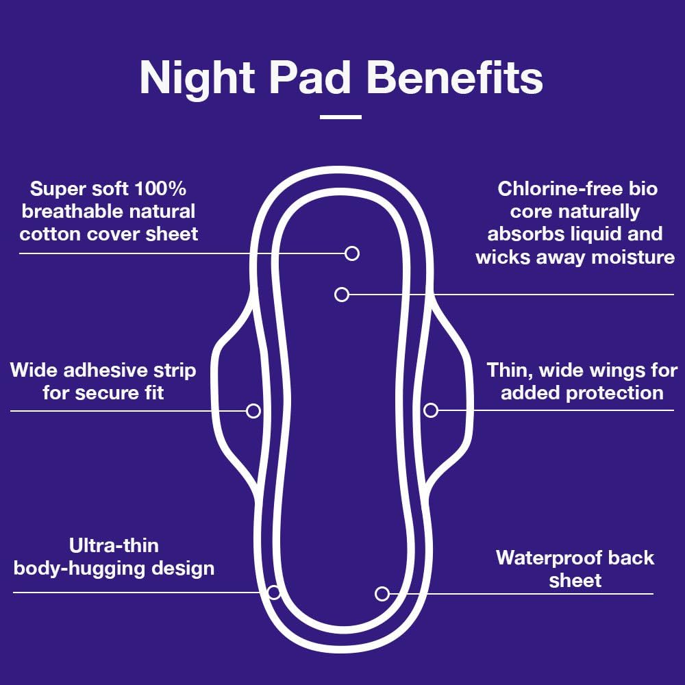 Our Veeda Ultra-Thin Night Pads have a body-hugging design and are made with a breathable soft cover sheet. Our night pads are comfortable, secure, and provide reliable protection. Unlike other products, Veeda pads do not contain harmful chemicals making them safe for everyday use. Plus, they are hypoallergenic and dermatologically tested so they won't irritate your skin. Designed with wings to stay secure throughout the night.