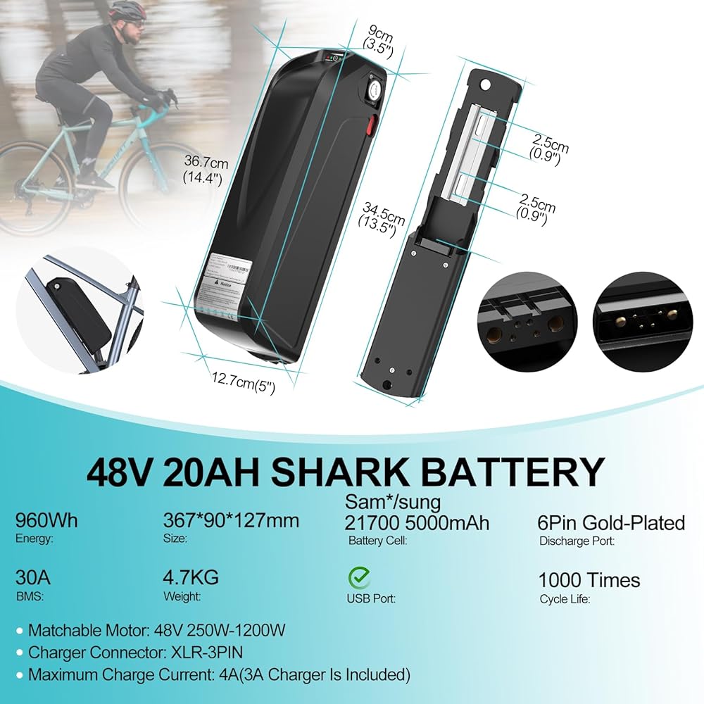 Parameter : This 48V 13Ah e-bike battery is compatible with mid motors and hub motors ranging from 50W to 1100W , including 1000W , 750W and 500W models. It features a maximum continuous discharge current of 30A . The dimensions are 367mm x 90mm x 111mm , with an XT60 Female discharge connector and 5 golden pin battery base