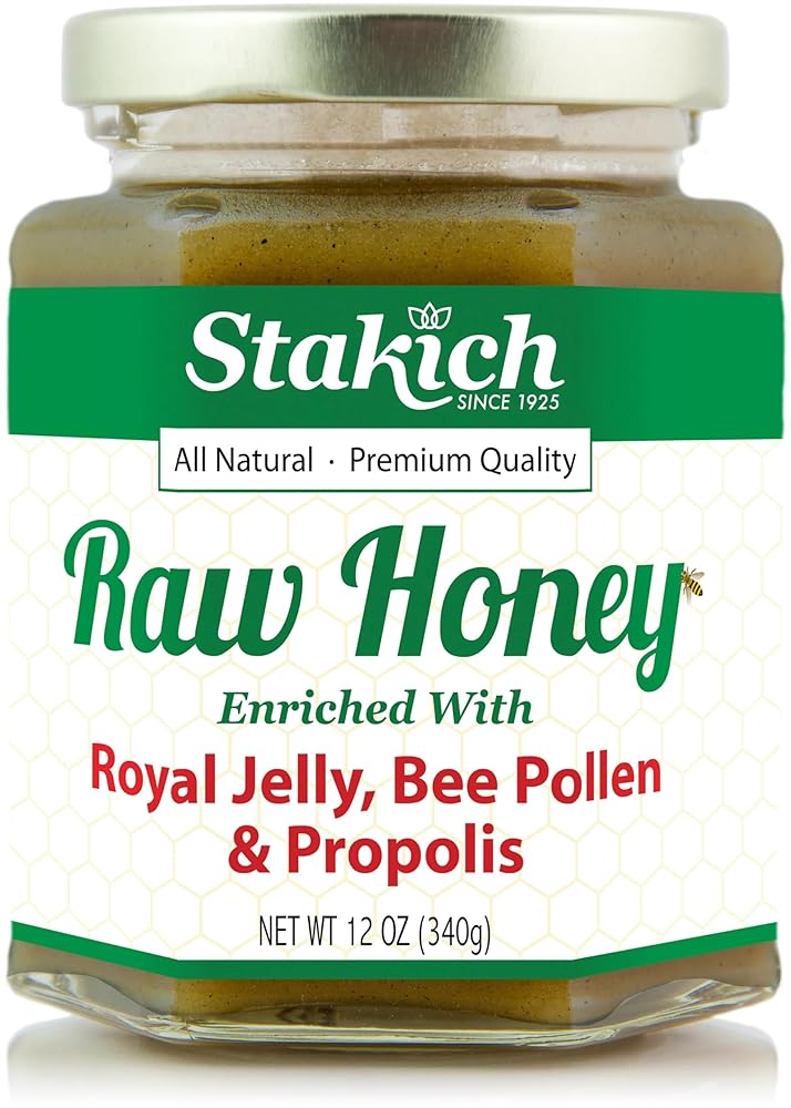 Stakich Royal Jelly, Bee Pollen, Propolis Raw Honey - Pure, Unprocessed, Unheated- Immune Support, Natural Energy, Brain Clarity, Sports Performance - 12 oz (12 oz)