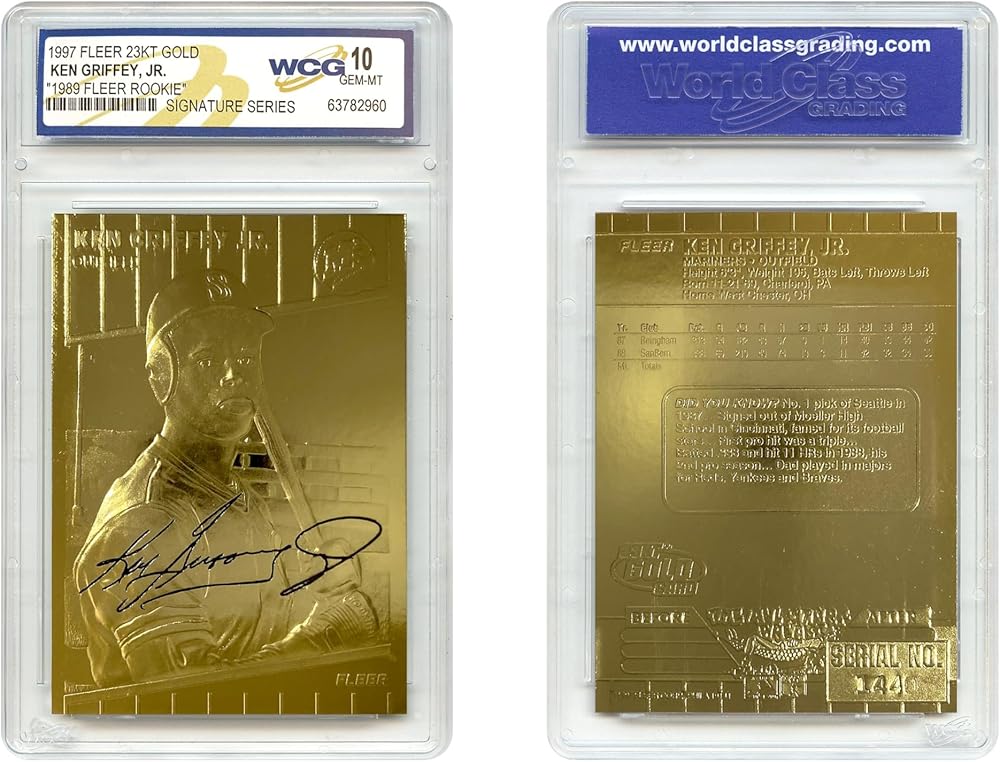 YEAR: 1997 PLAYER: Ken Griffey Jr. COMPANY/BRAND: Fleer Gold CONDITION: Gem Mint 10 LIMITED EDITION: Each Card Individually Serial Numbered NOTES: 1989 Fleer Rookie Sculptured Gold Card